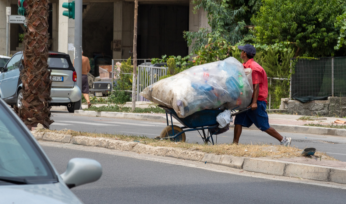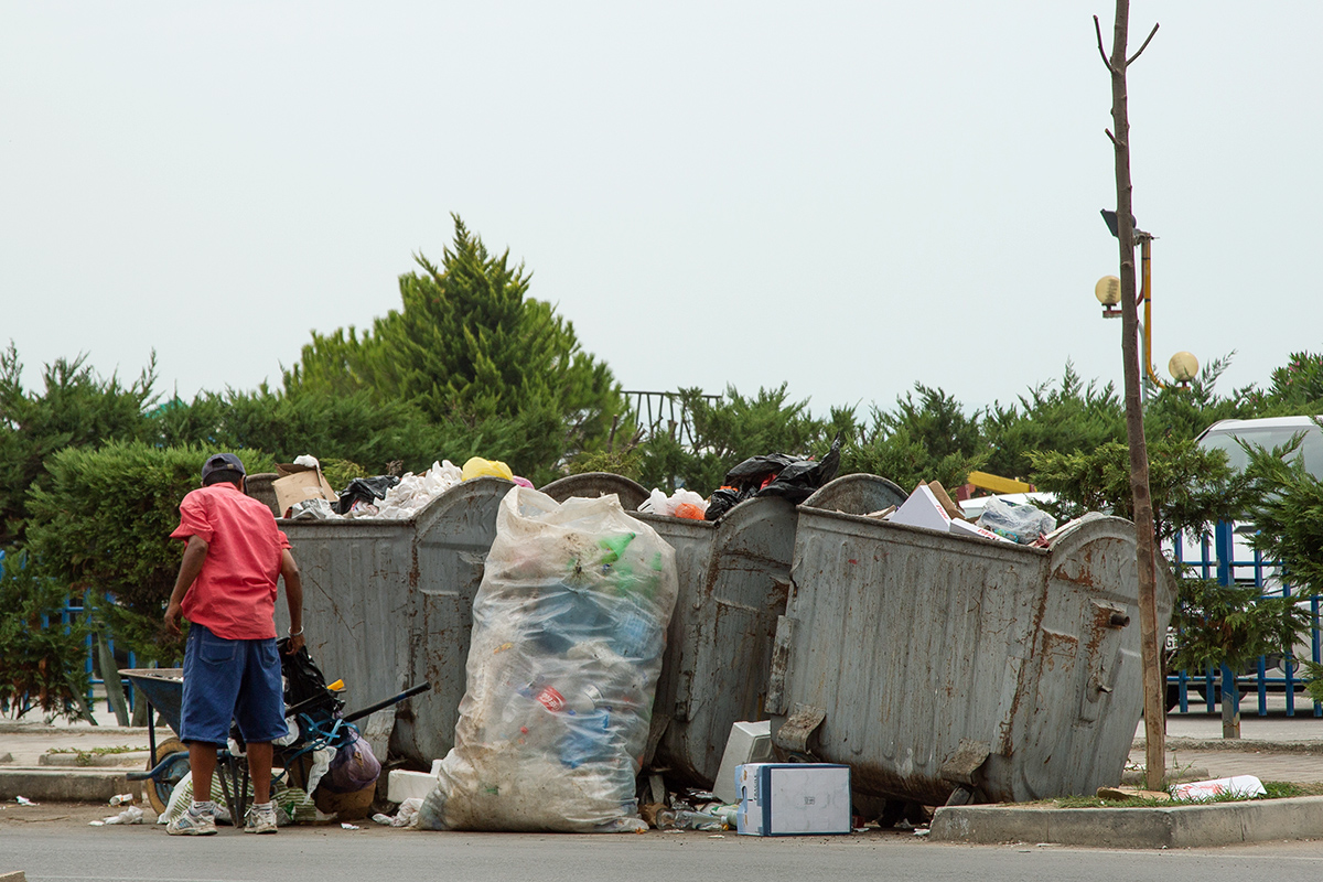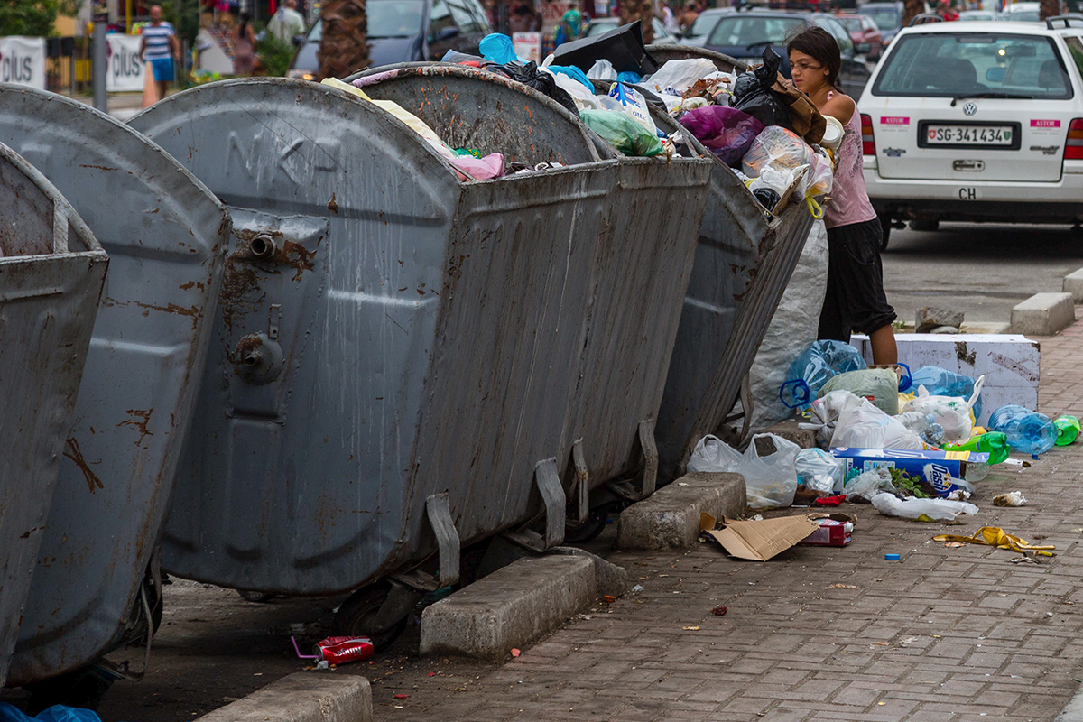 Na szerokich chodnikach stoją blaszane kontenery na śmieci. Śmieciarki nie wywożą ich jednak na wysypisko śmieci. Śmieci zabierają ludzie, którzy trójkołowymi rikszami zabierają je na obrzeża miasta, by tam dokonać selekcji. Zajmują się tym głównie rodziny Romów.
