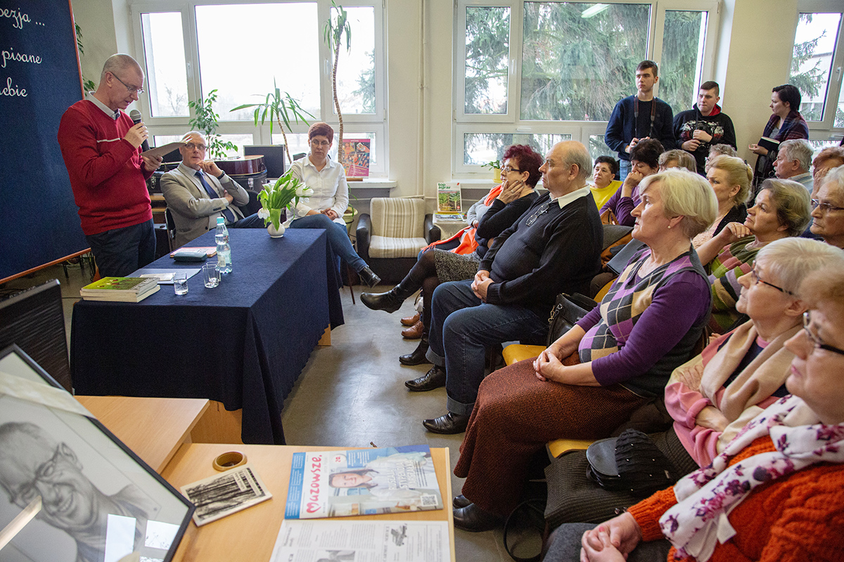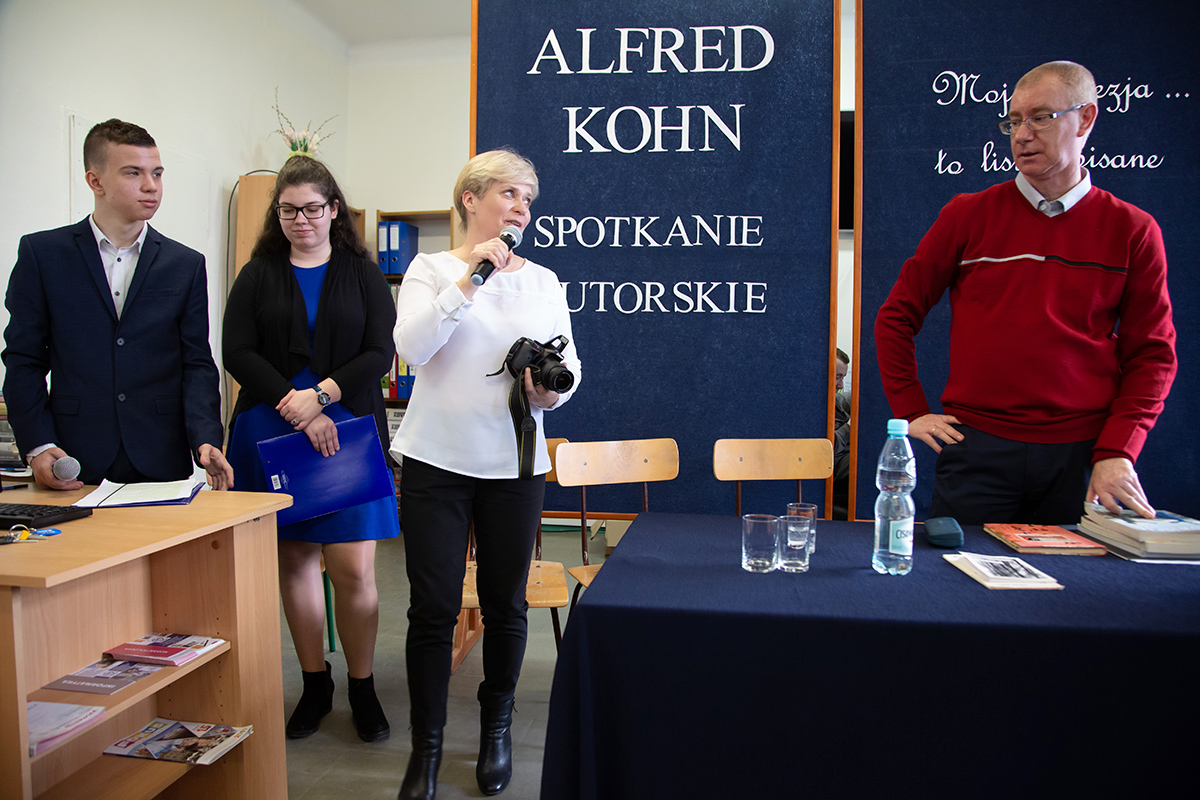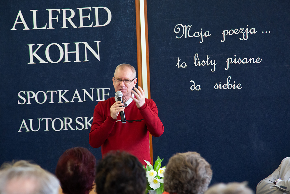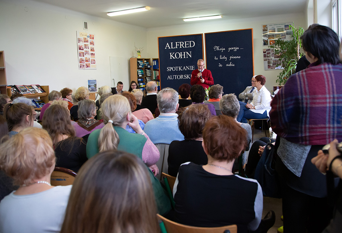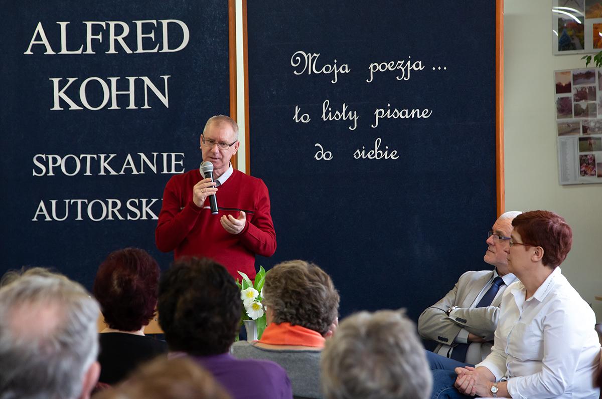 – Moja poezja nie jest rewolucyjna, nie zawiera w sobie określonych tendencji, nie idzie w wyznaczonym kierunku, nie jest za, nie jest przeciw w politycznej walce (…) to listy pisane do siebie – mówił Alfred Kohn do publiczności, która szczelnie wypełniała obszerną świetlicę Zespołu Szkół im. Żołnierzy Armii Krajowej.