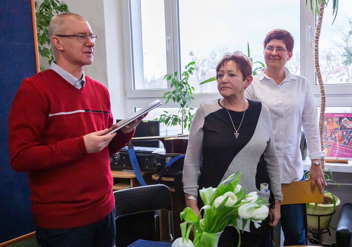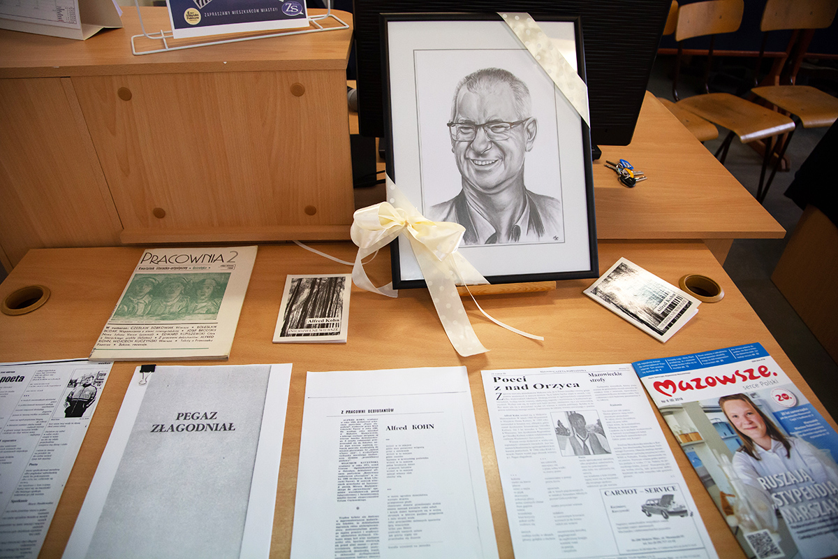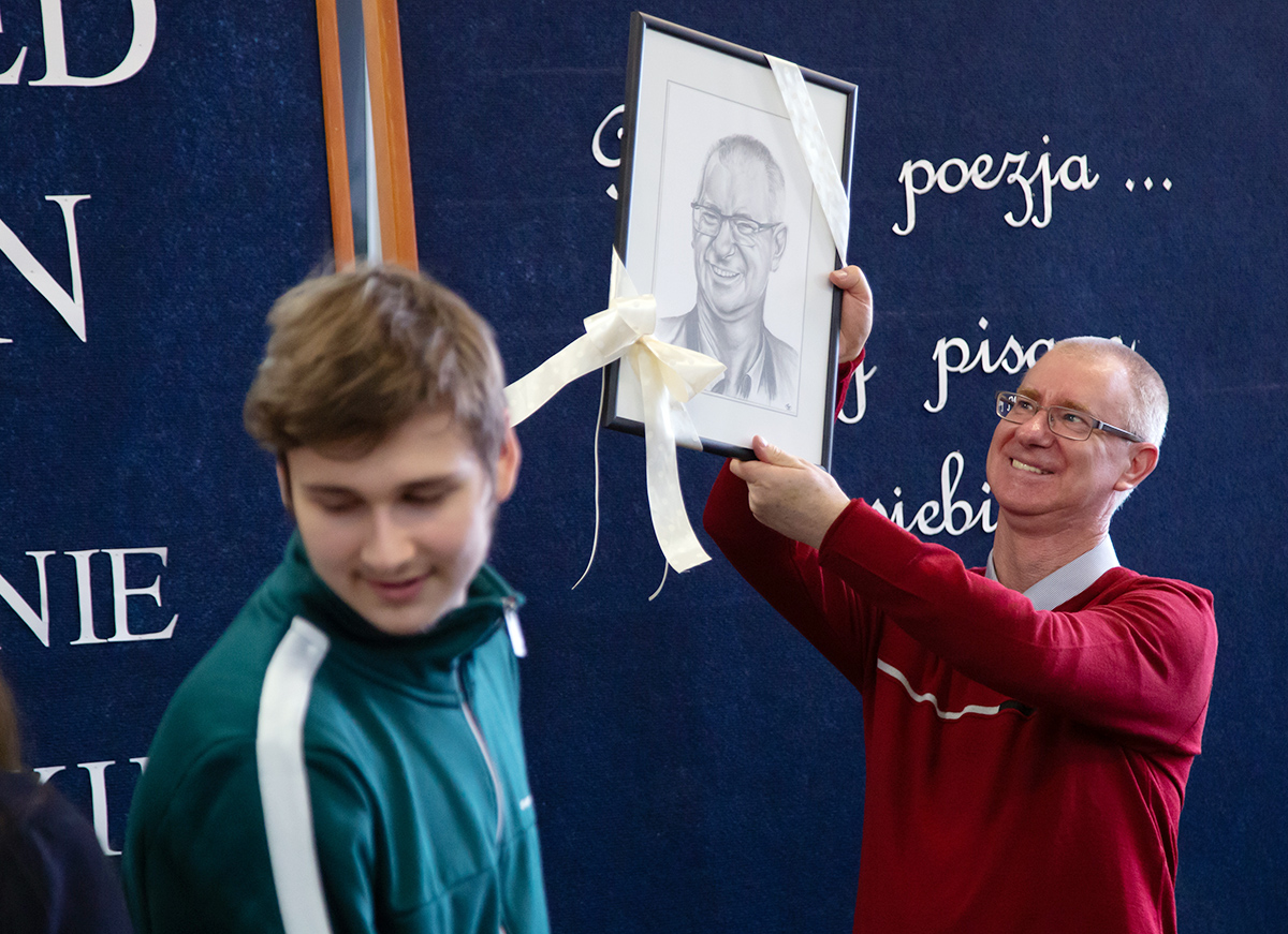 Mocnym akcentem na zakończenie spotkania było wykonanie przez Włodzimierza Żeglińskiego „Historii mojego miasta”, piosenki napisanej do jednego z wierszy Alfreda. A gdy przebrzmiały brawa, uczniowie wręczyli poecie własnoręcznie namalowany jego portret na pamiątkę wzruszającego spotkania. – Powieszę go w moim gabinecie – obiecał Alfred Kohn, któremu wizerunek najwyraźniej przypadł do gustu. Przy najbliższej okazji sprawdzimy i przekażemy