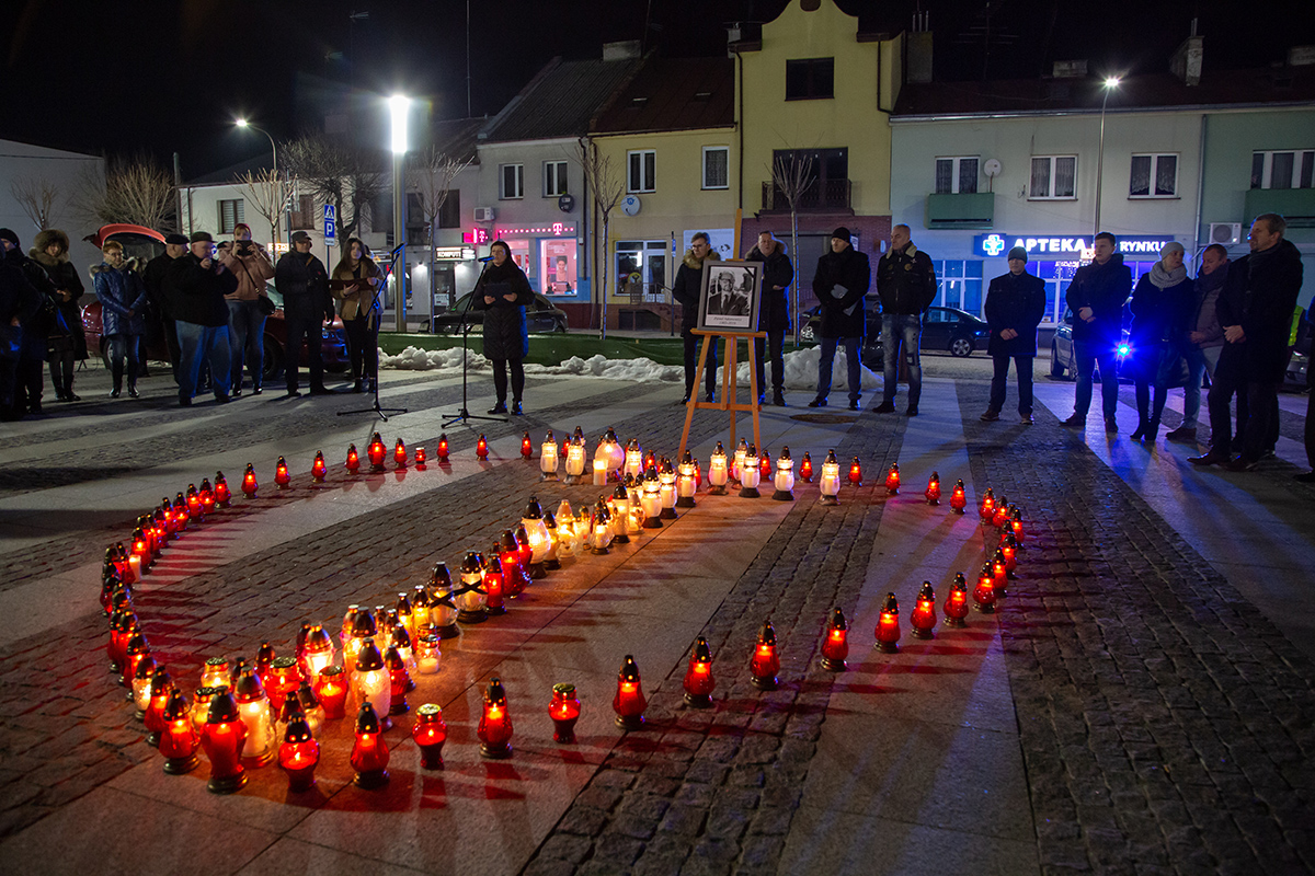 Kilkadziesiąt osób zebrało się dziś o 17:00 na makowskim Rynku, by uczcić pamięć Pawła Adamowicza, prezydenta Gdańska, zamordowanego w ubiegłą niedzielę w czasie finału Wielkiej Orkiestry Świątecznej Pomocy. Wśród zebranych były osoby w różnym wieku, byli starsi mieszkańcy Makowa, młodzież, radni, samorządowcy ze starostą makowskim Zbigniewem Deptułą i burmistrzem Makowa Mazowieckiego Tadeuszem Ciakiem, który był inicjatorem tego spotkania.