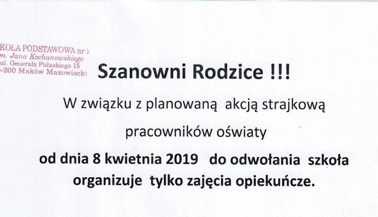 W związku z planowaną akcją strajkową pracowników oświaty w terminie od 08.04.2019 r. do odwołania, nie gwarantujemy, że będziemy w stanie zapewnić realizację zajęć dydaktycznych i wychowawczych dla uczniów z naszej szkoły.