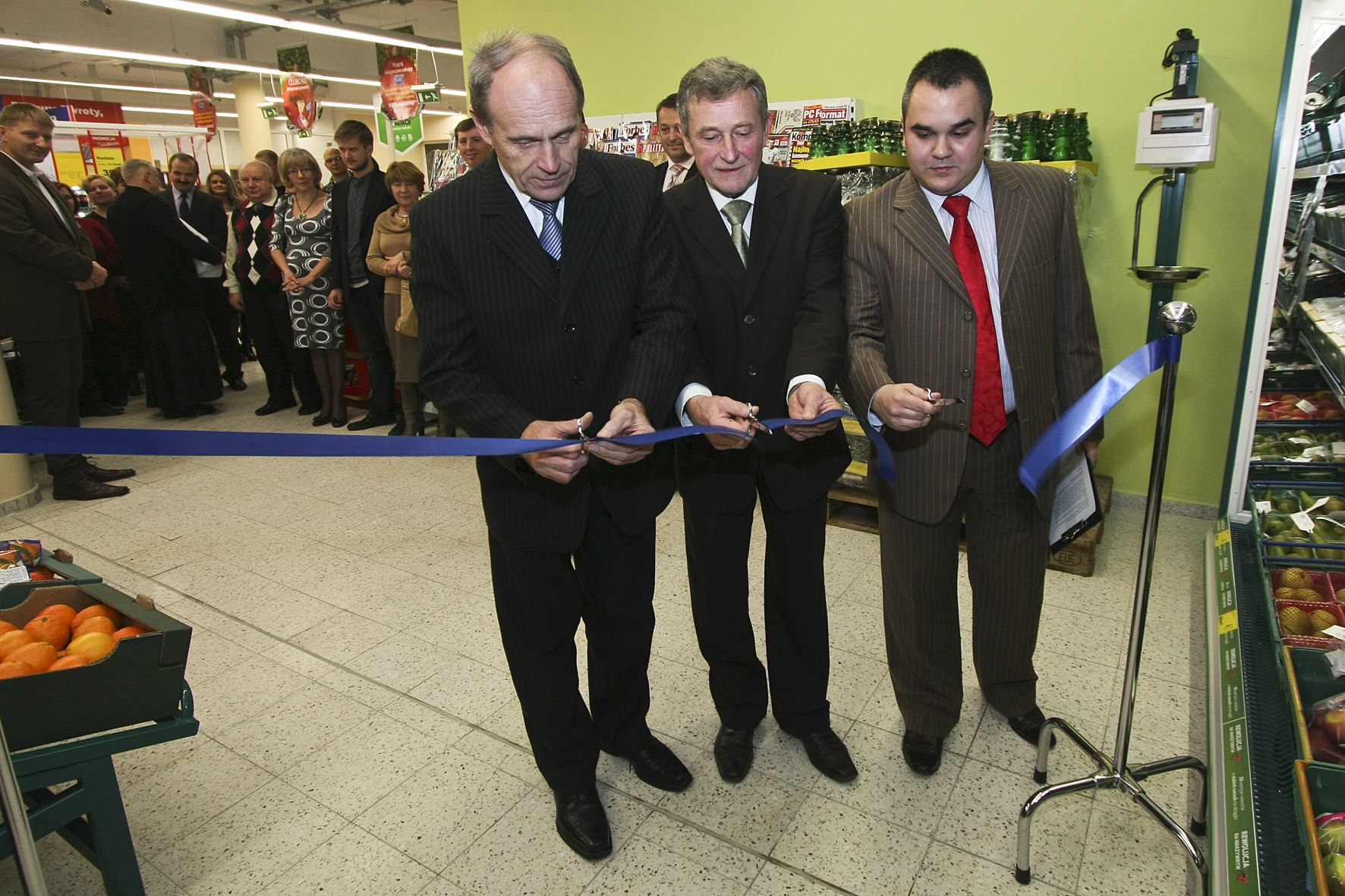 - Przecięcia wstęgi do nowego sklepu dokonali: Jan Rutkowski, Karol Murawski i Janusz Gójski.