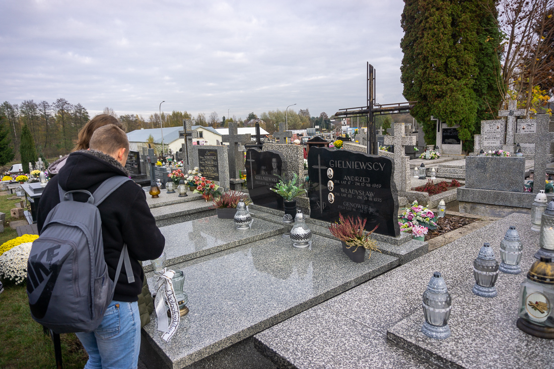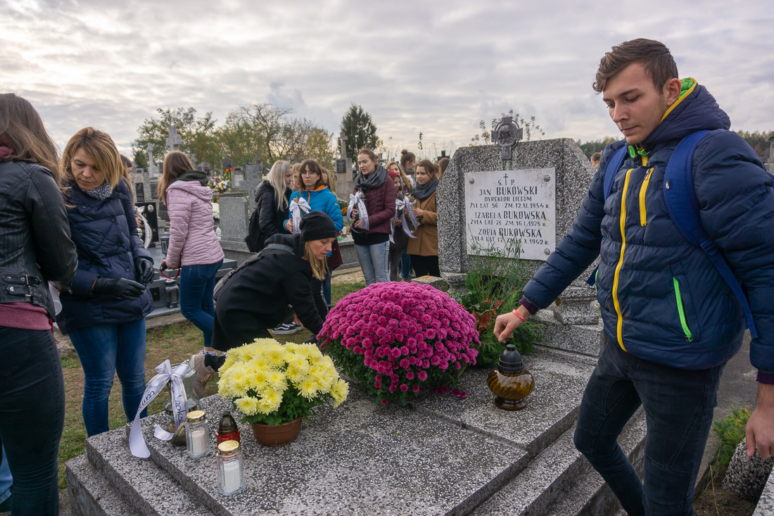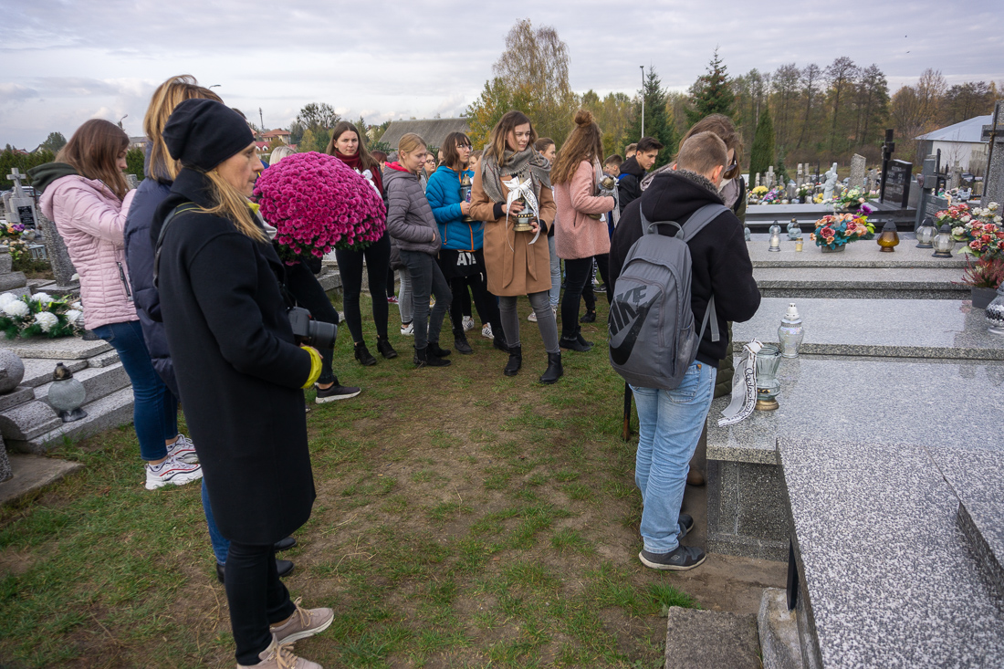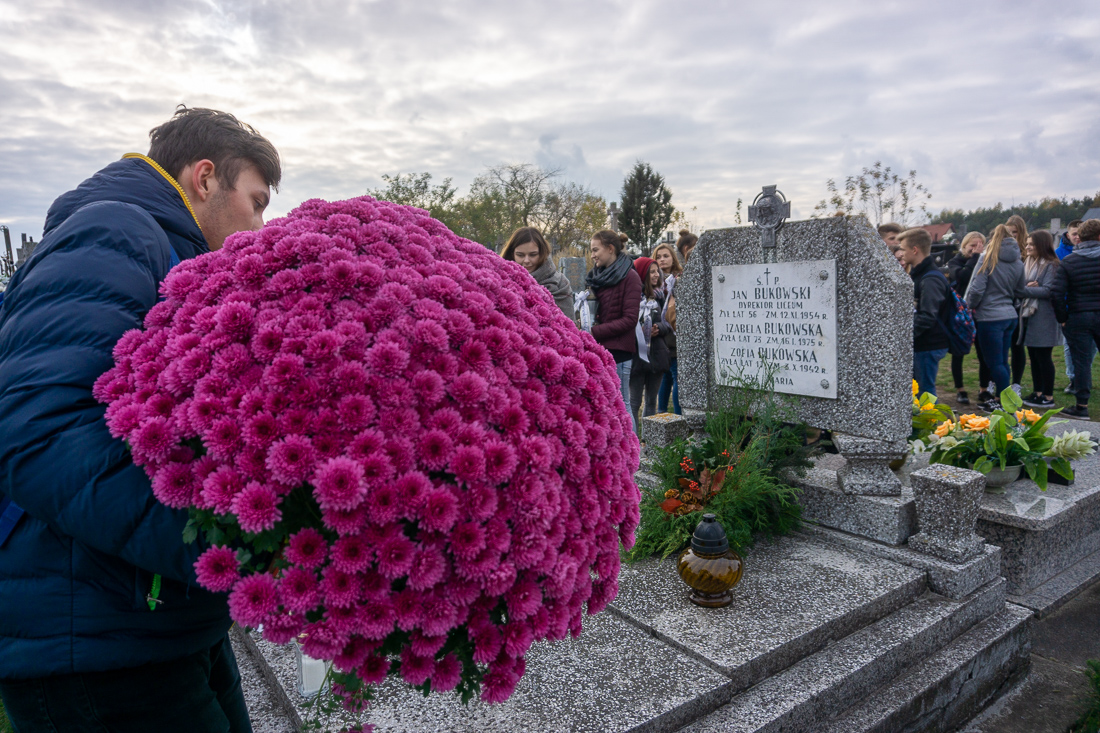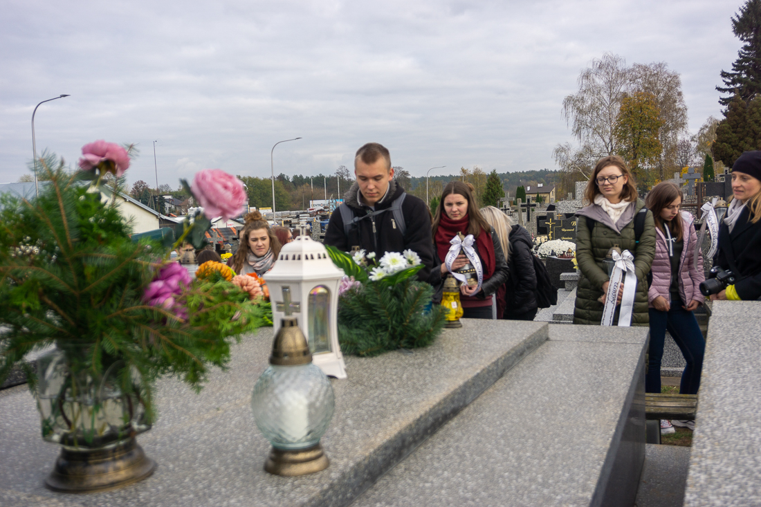 Na zdjęciach: ekspozycja w LO oraz uczniowie klas I F i II B makowskiego liceum wraz z wychowawczyniami, Agnieszką Bobińską i Ewą Rogalską na makowskim cmentarzu, 31.10.2019 r..
