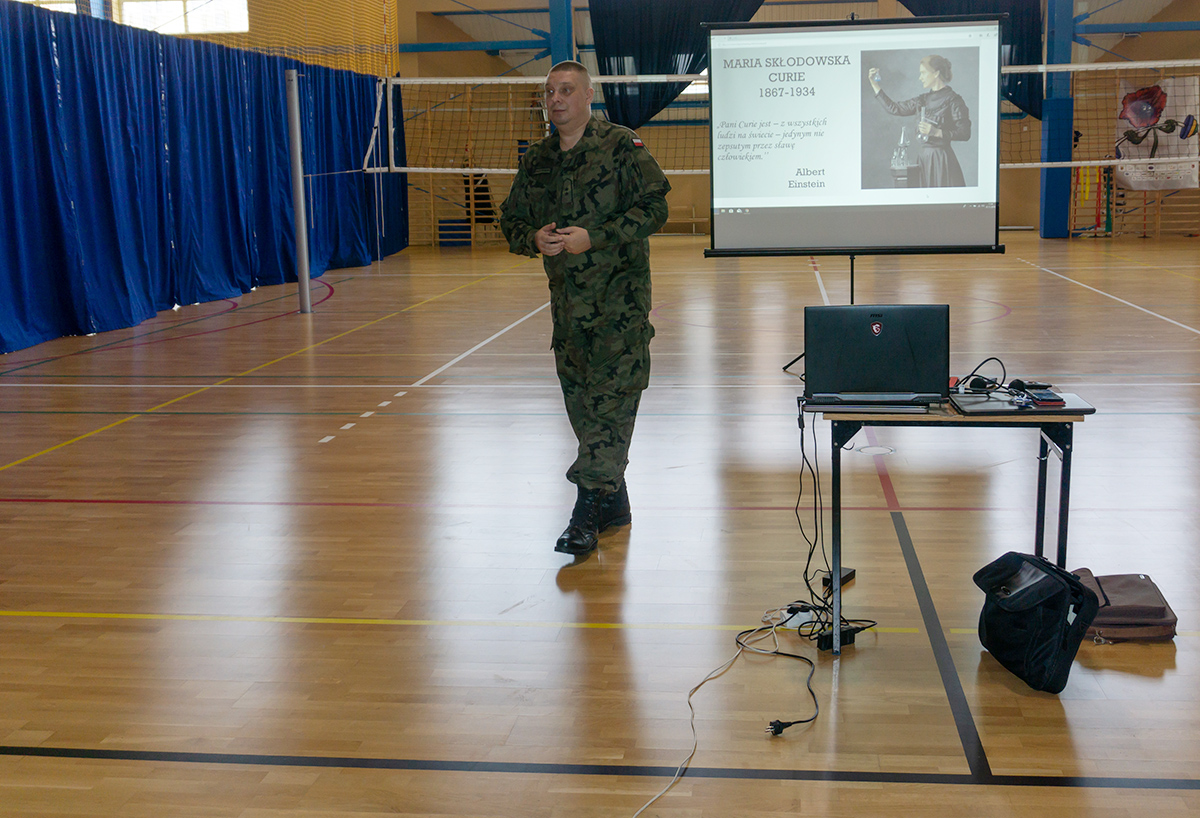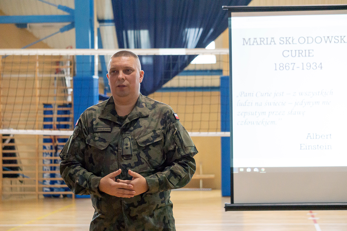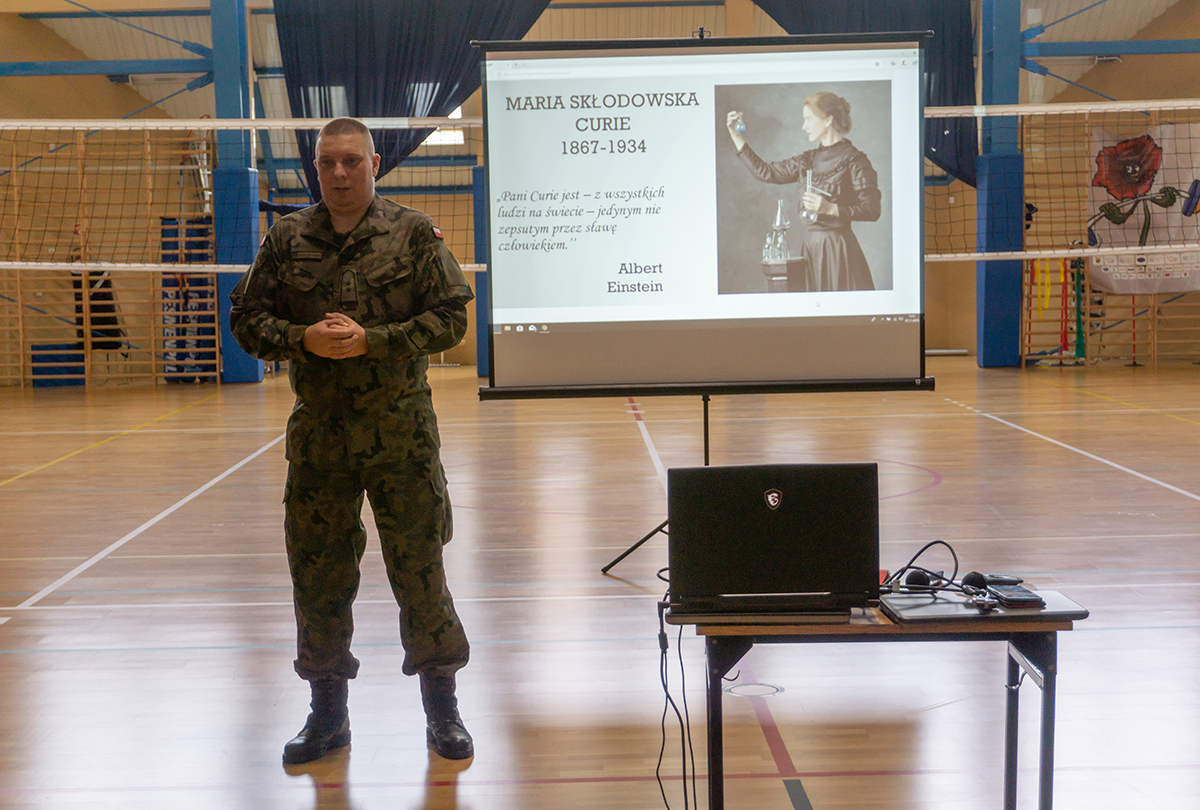 W południe rozpoczął się wykład gościa Dnia Patronki – starszego chorążego Jacka Mierzejewskiego. Prelegent mówił o nowoczesnych metodach analitycznych badania próbek środowiskowych. Prelekcję na temat polimerów wygłosiła również uczennica LO Patrycja Tyburska, działająca w fundacji Przyszłość w Nauce.