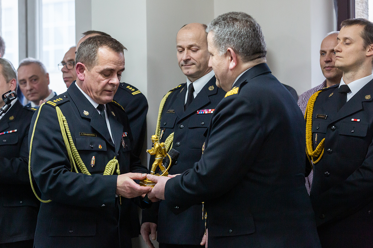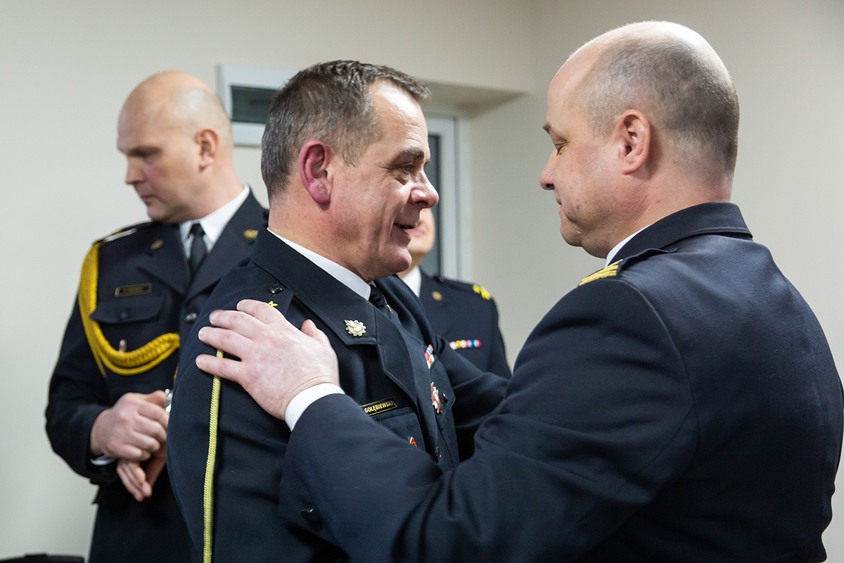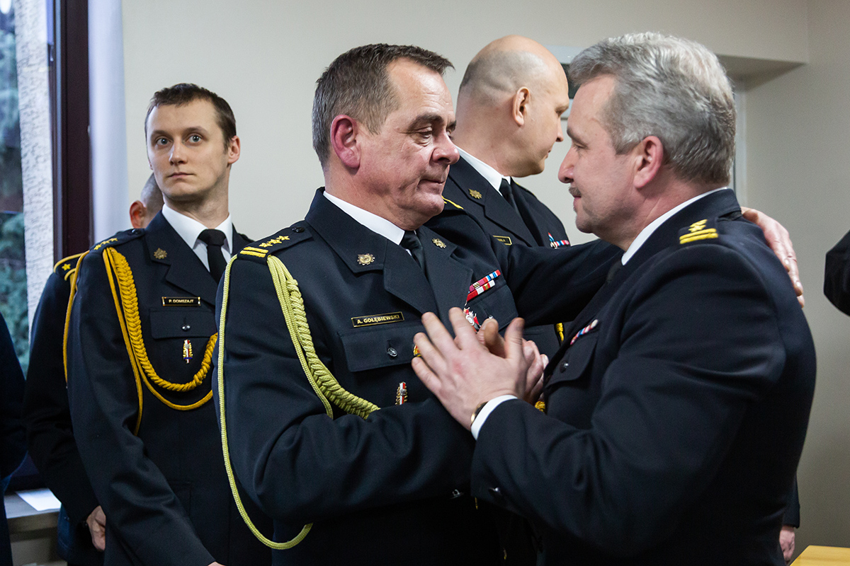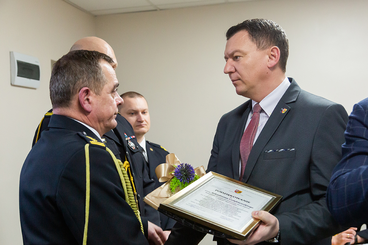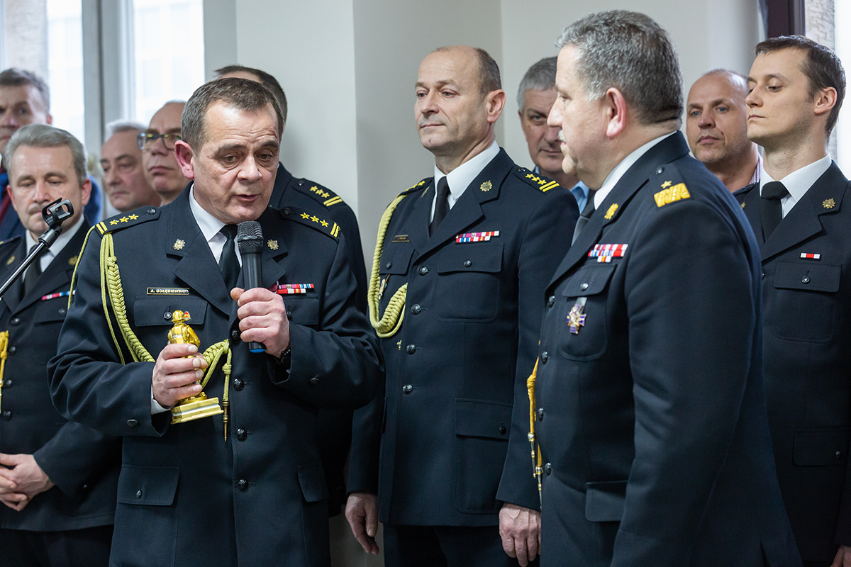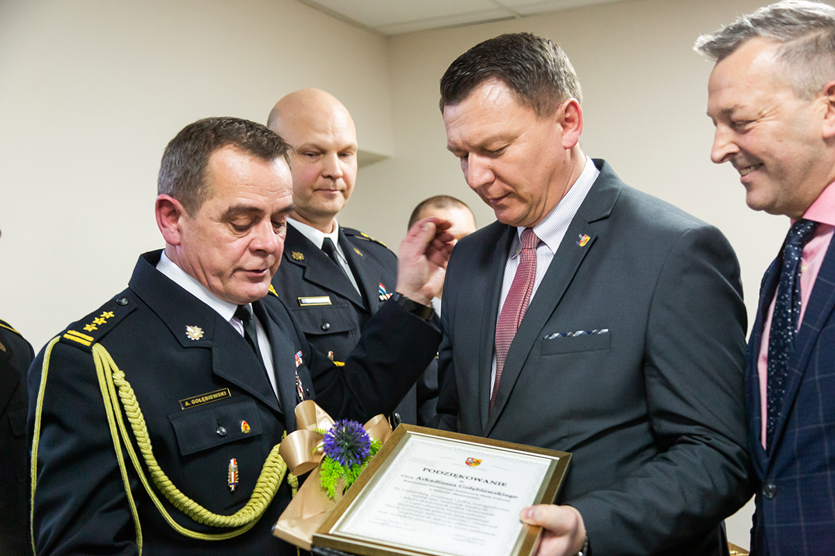 Podczas uroczystego apelu, Komendant Wojewódzki Państwowej Straży Pożarnej nadbryg. Bogdan Łasica serdecznie podziękował Arkadiuszowi Gołębiewskiemu za prawie 35 lat służby na rzecz polskiego pożarnictwa i ochrony przeciwpożarowej. W swoim wystąpieniu wspomniał także o bardzo dobrej współpracy z jednostkami OSP oraz jednostkami samorządu terytorialnego.