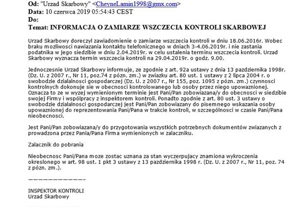 Uwaga na fałszywe maile o wszczęciu kontroli skarbowej !!!