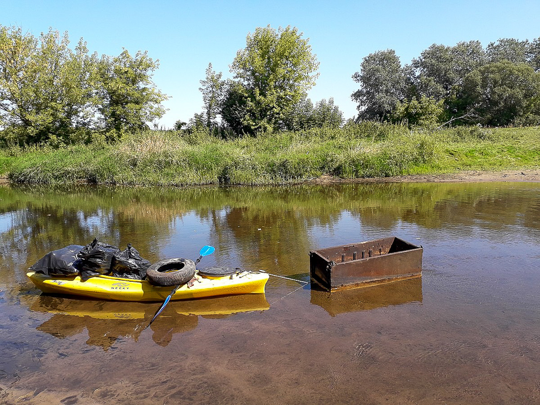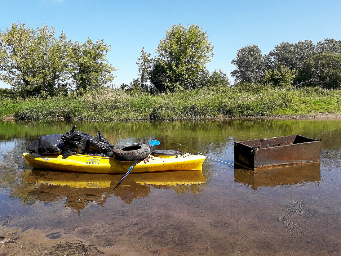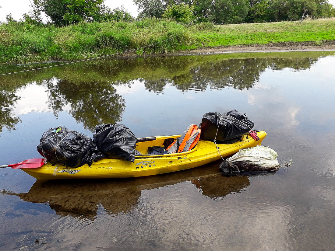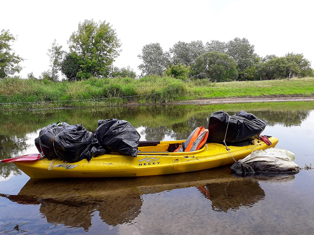 Na trasie z Makowa do Bobrowego Dworu zapełniliśmy odpadami dwa kajaki. Po drodze, przy oczyszczalni ścieków udało nam się wyjąć na brzeg wielką płachtę z tworzywa sztucznego, która straszyła swoim widokiem od wiosny.