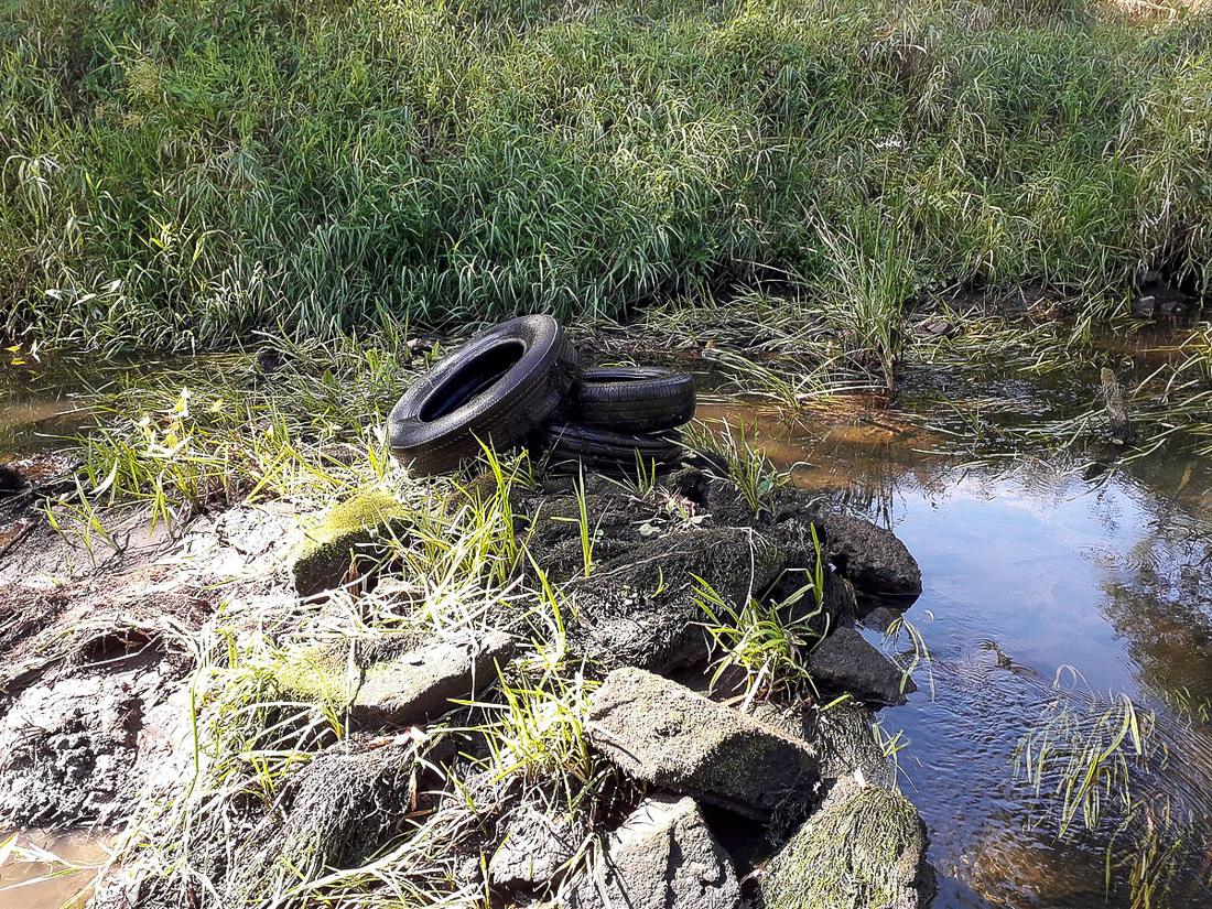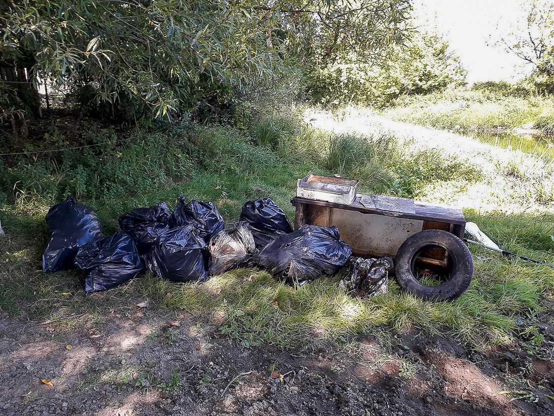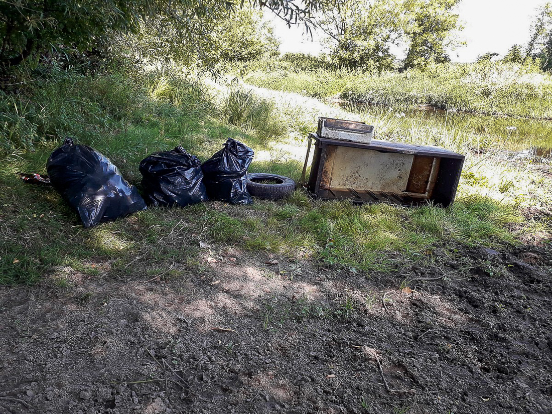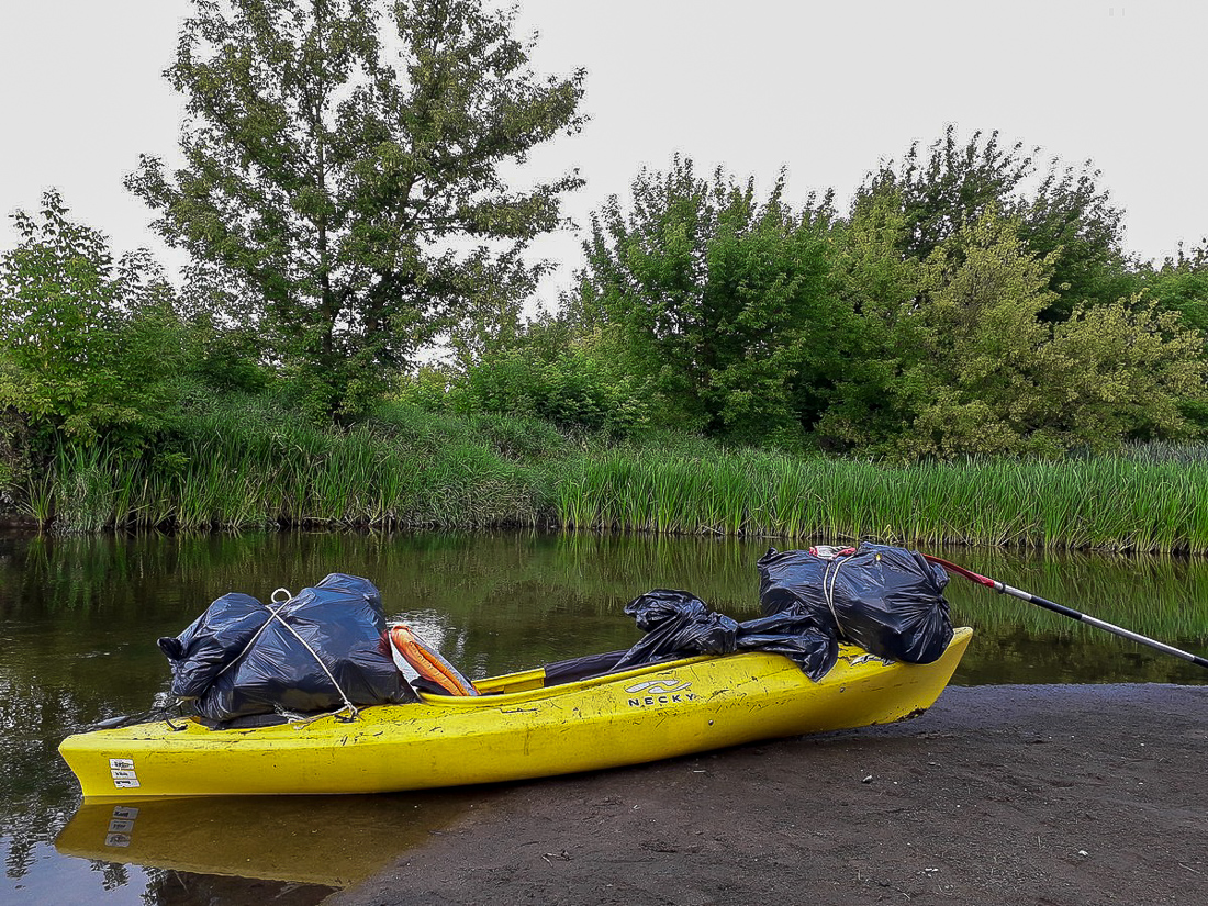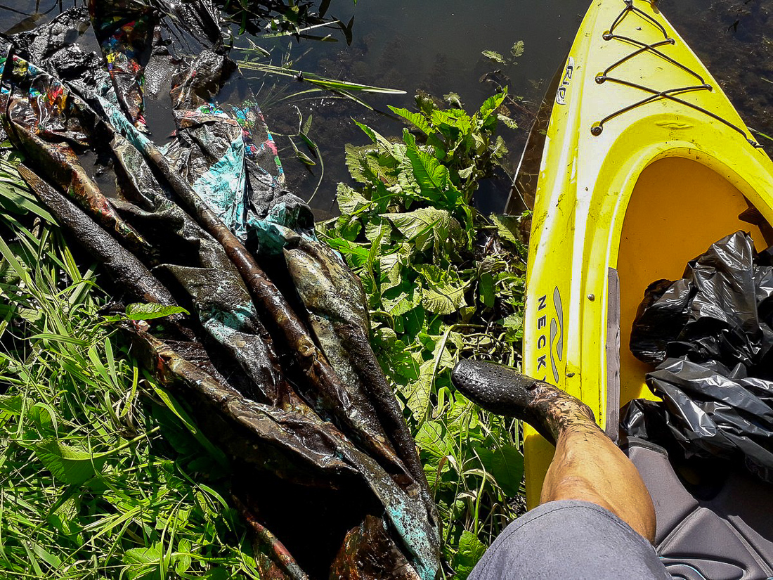 Na trasie z Makowa do Bobrowego Dworu zapełniliśmy odpadami dwa kajaki. Po drodze, przy oczyszczalni ścieków udało nam się wyjąć na brzeg wielką płachtę z tworzywa sztucznego, która straszyła swoim widokiem od wiosny.