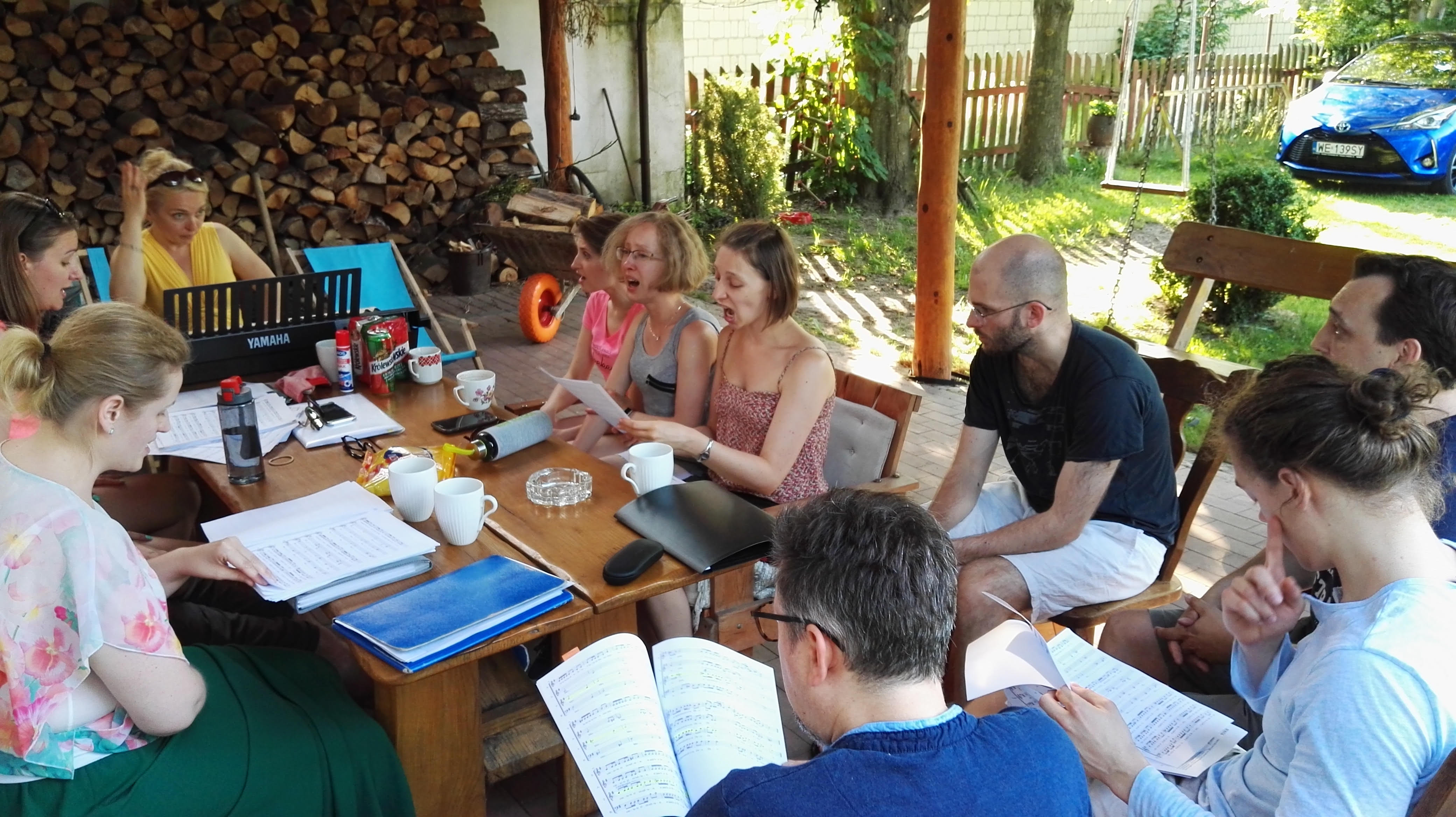 Na zdjęciach: dyrygentka z chórem Elżbieta Siczek wraz  z częścią zespołu, przygotowania w Chacie Pod Dębami.