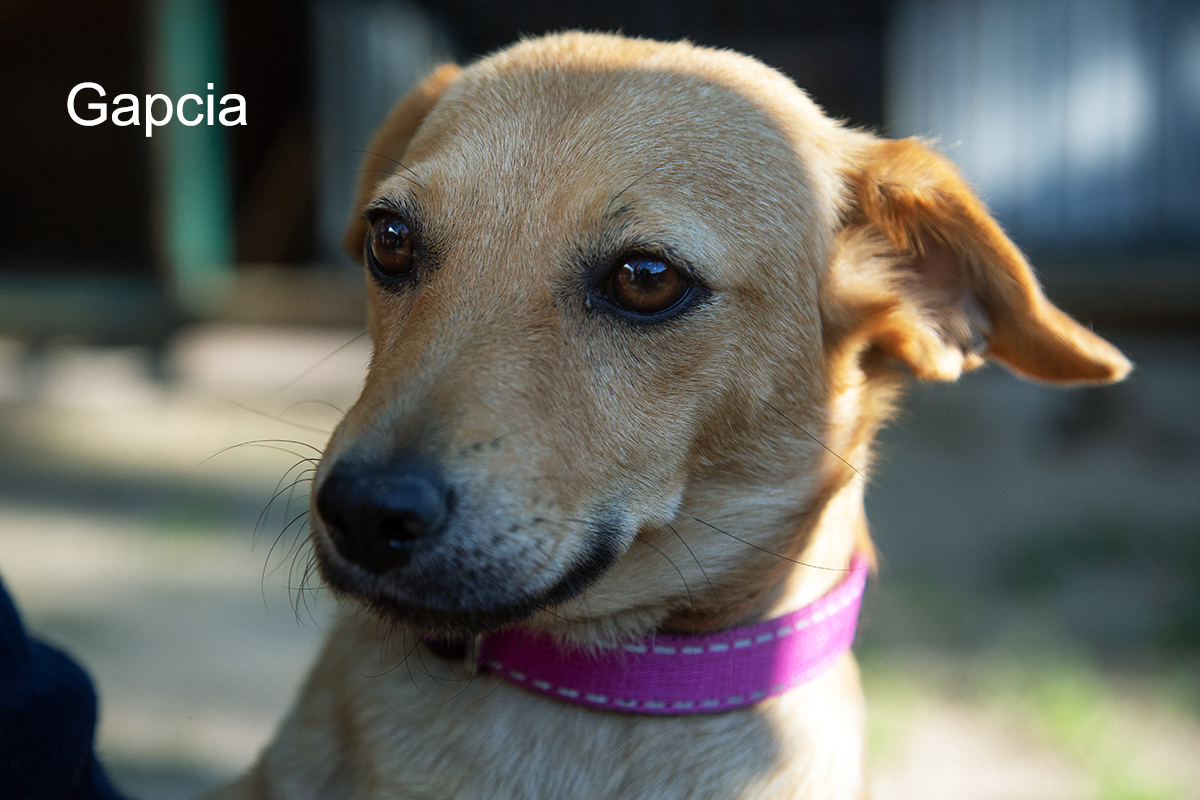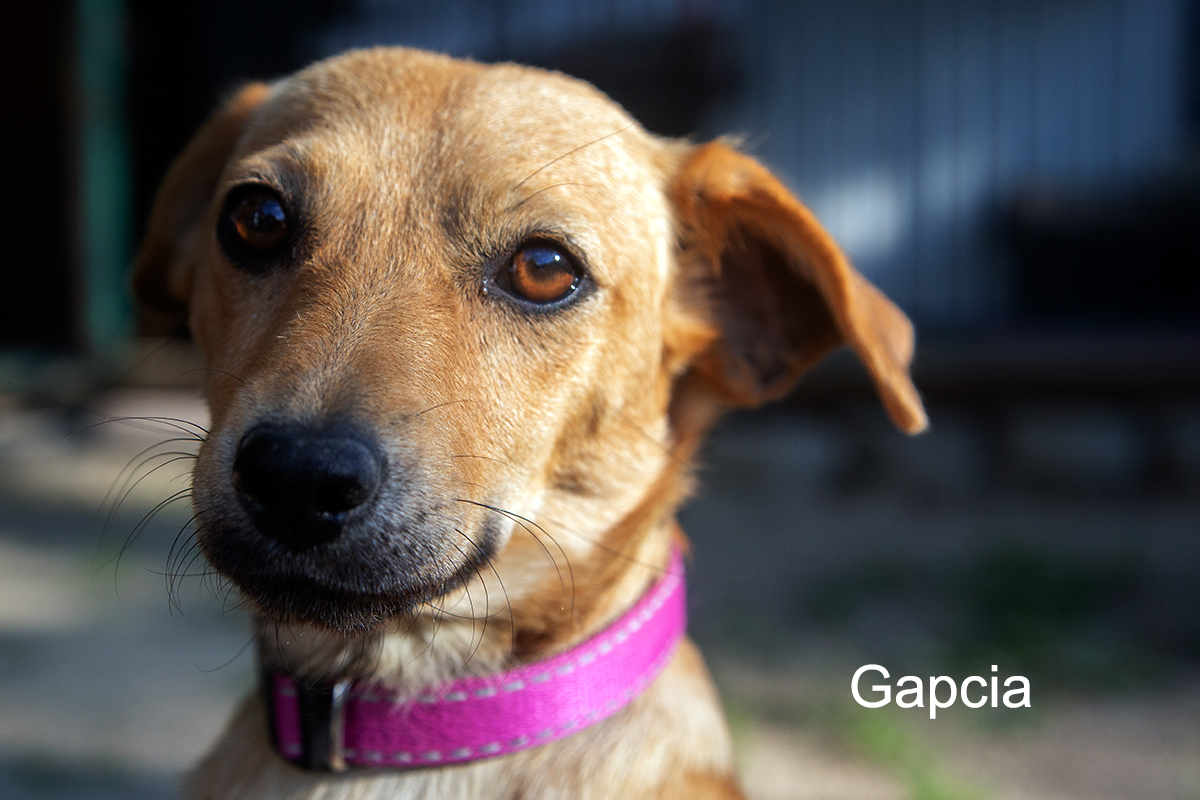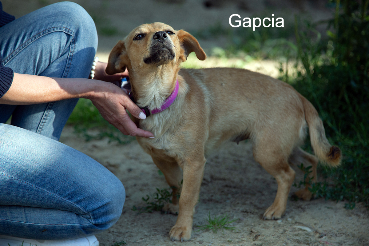 Gapcia – cudowna mała suczka, która dała się poznać jako miła, spokojna, spragniona głaskania i przytulania istotka. Jest zaszczepiona, odrobaczona, zabezpieczona od pcheł i kleszczy. Umówiony ma termin sterylizacji. Ładnie chodzi na smyczy, toleruje inne psy i prawdopodobnie koty. Jest niekonfliktowa. Lubi dzieci, przybiega, łasi się do człowieka, merda ogonkiem.