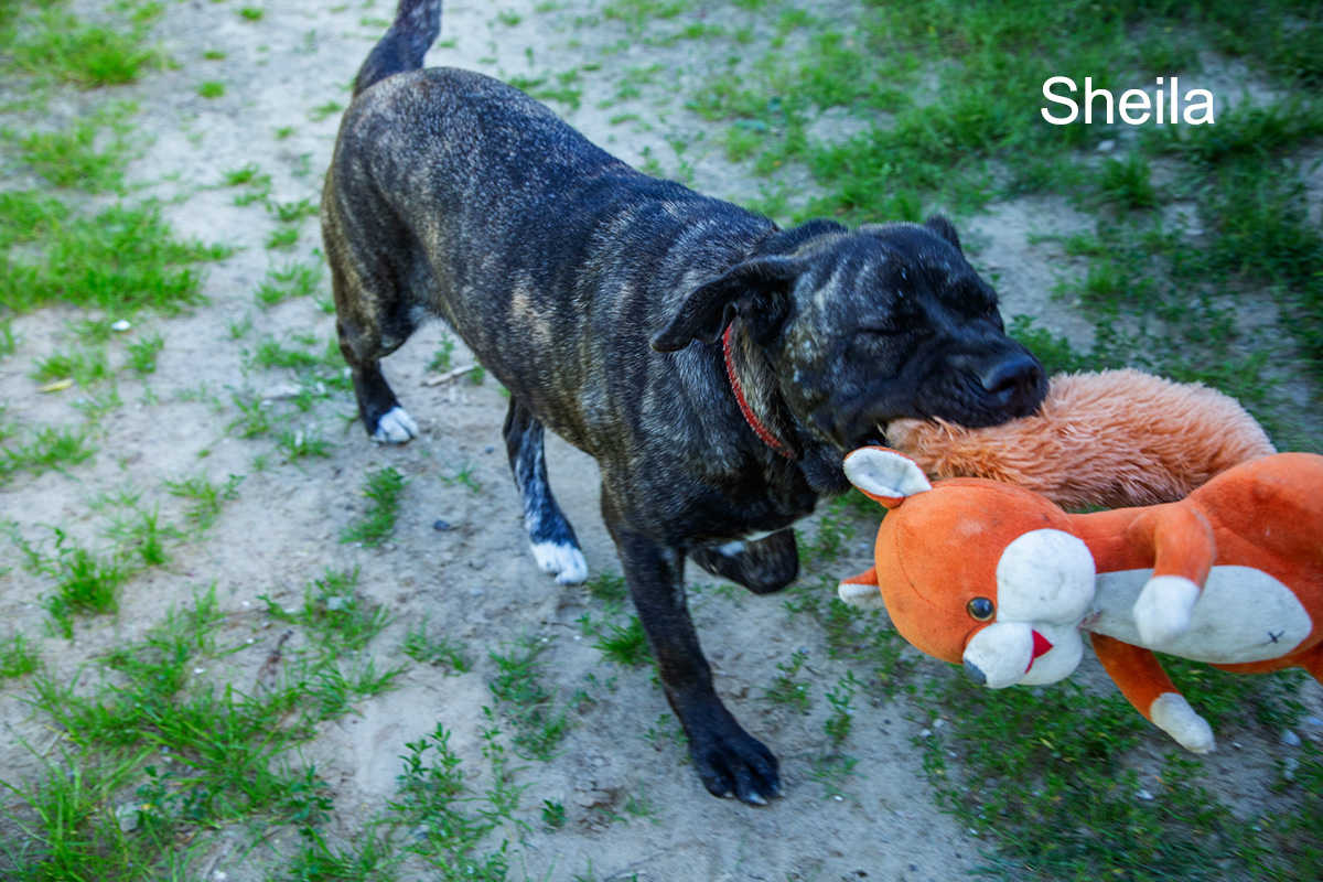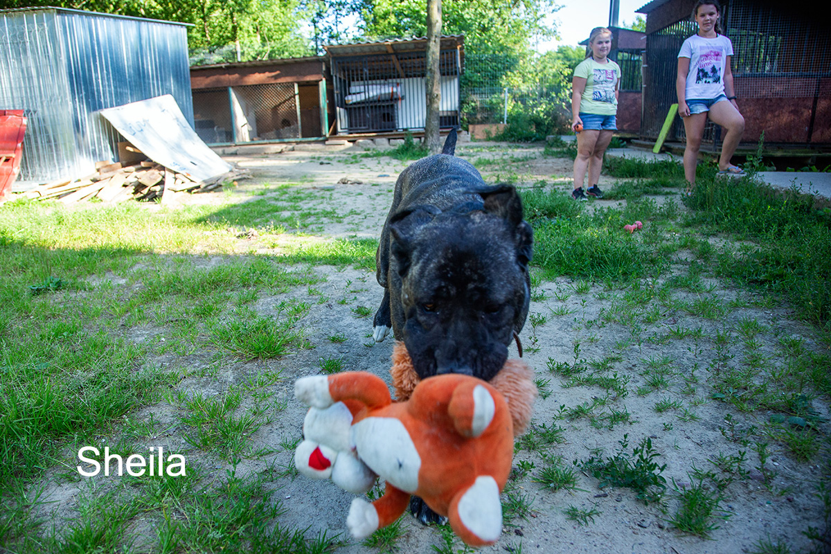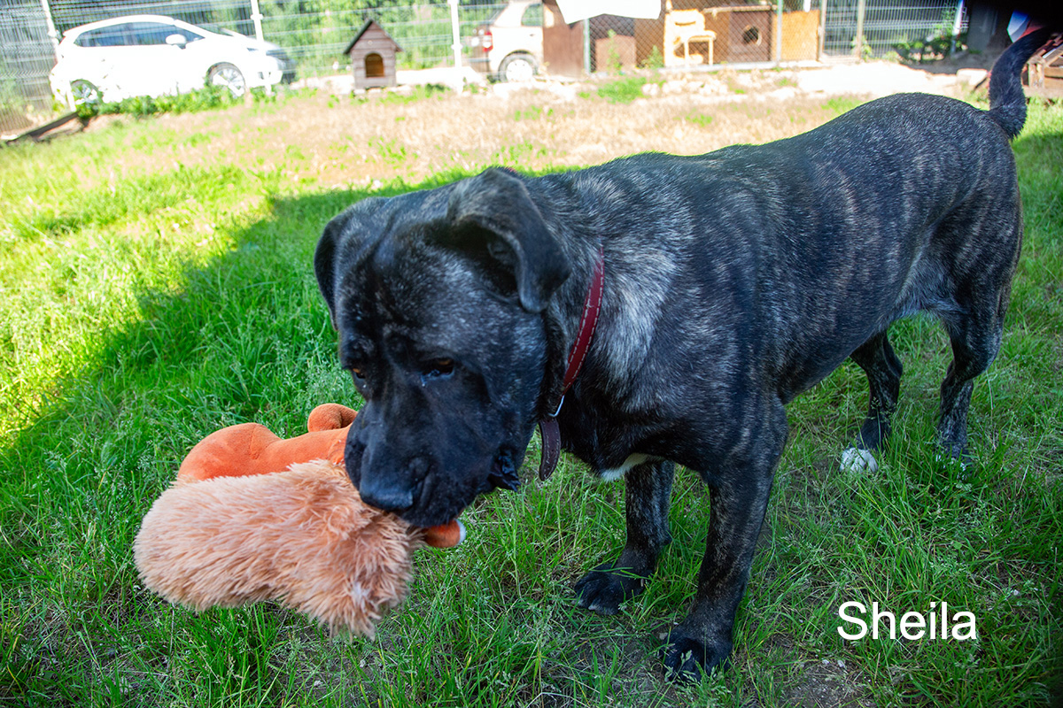 Sheila to suczka w typie cane corso, popielata, pręgowana. Jej wiek został oceniony na ok 1,5 roku, waga 40 kg. Jest bardzo miła i łagodna. Chętnie przytula się do ludzi i chce się bawić. Szuka nowego, ciepłego i pełnego miłości domu.