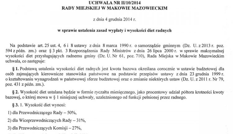 Pytali nas Czytelnicy o wysokość wynagrodzeń miejskich radnych. Określa je uchwała Rady Miejskiej w Makowie Mazowieckim z dnia 4 grudnia 2014 r. w sprawie ustalenia zasad wypłaty i wysokości diet radnych.