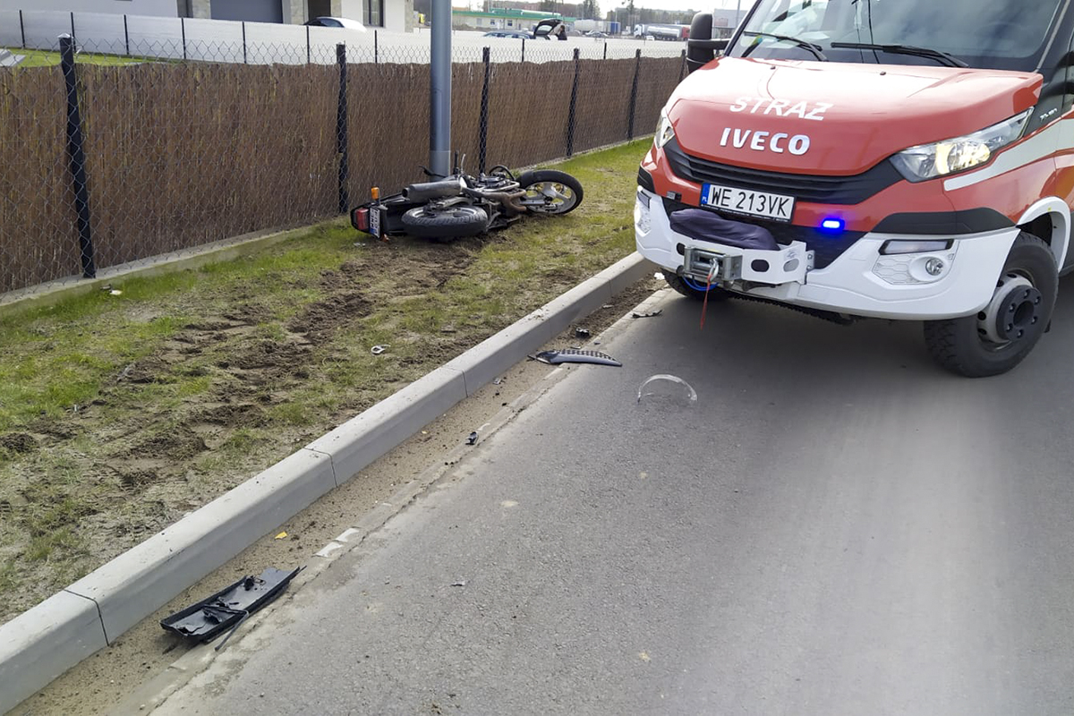 – Zgłoszenie o wypadku wpłynęło do nas o godzinie 11:51 – poinformował nas Bartosz Kołodziejski z Państwowej Straży Pożarnej w Makowie Maz. – Na miejsce zdarzenia skierowany został jeden zastęp – sześciu ratowników pod dowództwem Pawła Domszajta. Poszkodowany motocyklista został zabrany do szpitala przez karetkę pogotowia ratunkowego