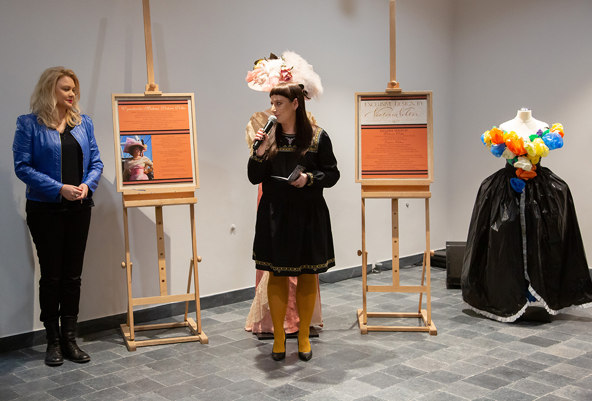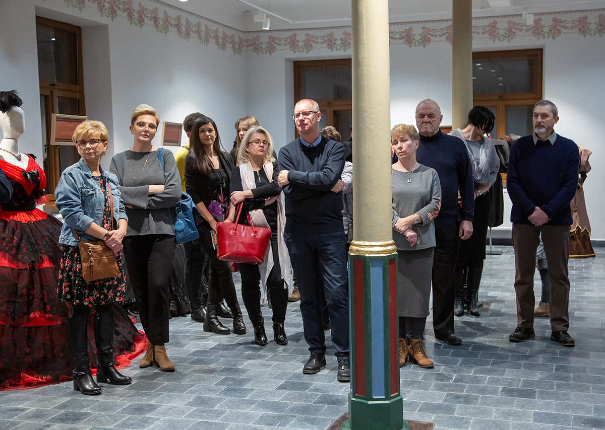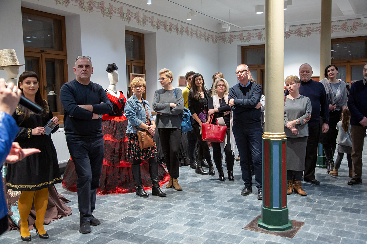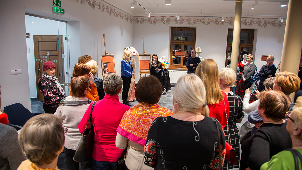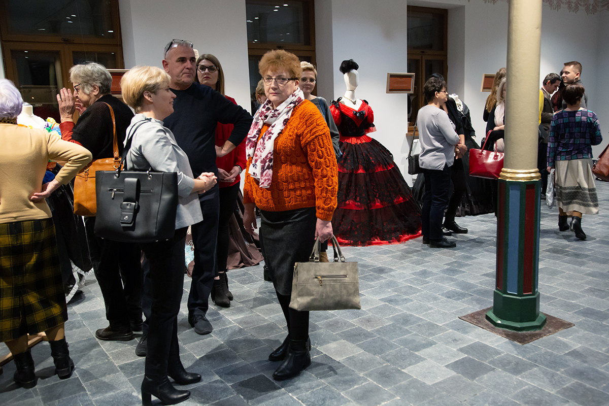 Małgorzata Retkowska opowiadała o tym, jak powstały prezentowane stroje. Wielkim zaskoczeniem dla uczestników wernisażu była informacja, że te imponujące kostiumy zostały uszyte głównie z tkanin odpadowych i elementów starych ubrań, które na strychach przeleżały nawet kilkadziesiąt lat.