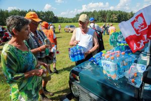 Na ciągnikowej przyczepce przywieźli podpiwkowe piwo. – Oni sobie tę łąkę od lat upodobali – mówi pani Rozalia. – Tu się co roku zatrzymują na odpoczynek. A my z mężem co roku przywozimy im domowe piwo, które bardzo im smakuje.  Rzeczywiście, do przyczepki ustawiła się kolejka spragnionych pielgrzymów. Druga kolejka ustawiła się przed samochodem państwa Chodkowskich, którzy także częstowali pielgrzymów chłodnymi napojami.