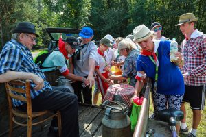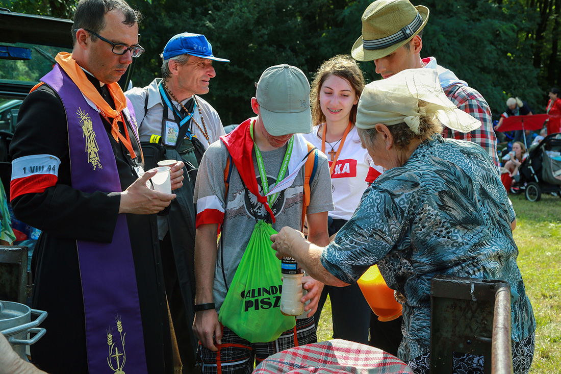 Na ciągnikowej przyczepce przywieźli podpiwkowe piwo. – Oni sobie tę łąkę od lat upodobali – mówi pani Rozalia. – Tu się co roku zatrzymują na odpoczynek. A my z mężem co roku przywozimy im domowe piwo, które bardzo im smakuje.  Rzeczywiście, do przyczepki ustawiła się kolejka spragnionych pielgrzymów. Druga kolejka ustawiła się przed samochodem państwa Chodkowskich, którzy także częstowali pielgrzymów chłodnymi napojami.