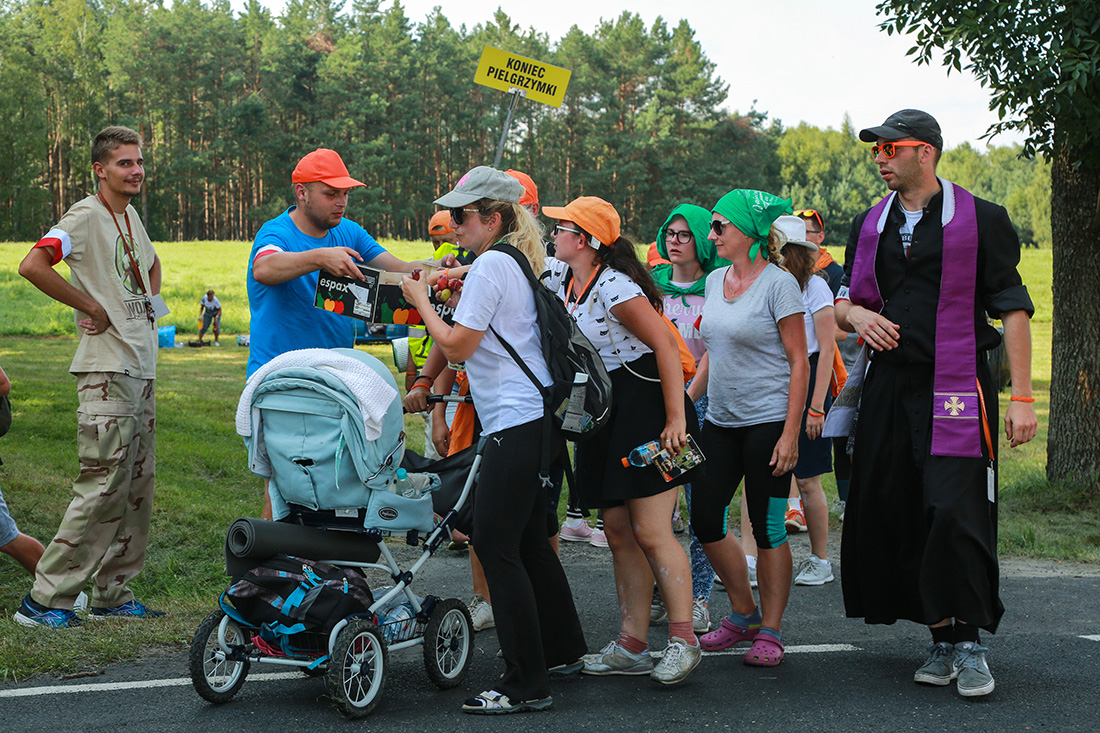 Wyglądały na zadowolone. – Tu jest tylu życzliwych ludzi, którzy a to zagadną, a to czymś poczęstują, że dzieci czują się jak na atrakcyjnej wycieczce w gronie przyjaciół – tłumaczyła matka jednej z dziewczynek. Najstarszy pielgrzym ma w tym roku 74 lata. Cała pielgrzymka podzielona jest na 6 grup, w każdej idzie kilku księży – w sumie dziewiętnastu. Tego dnia – 1 sierpnia – uczestnicy pielgrzymki mieli na ramionach biało czerwone opaski, dla uczczenia rocznicy wybuchu Powstania Warszawskiego
