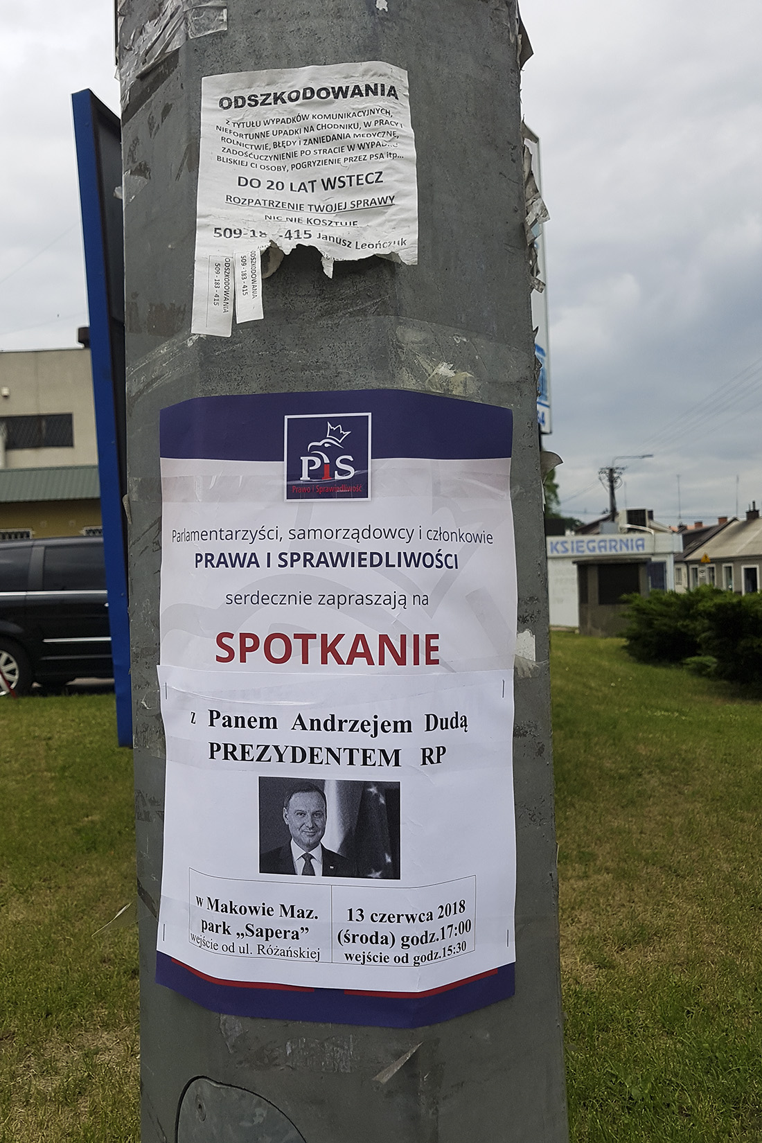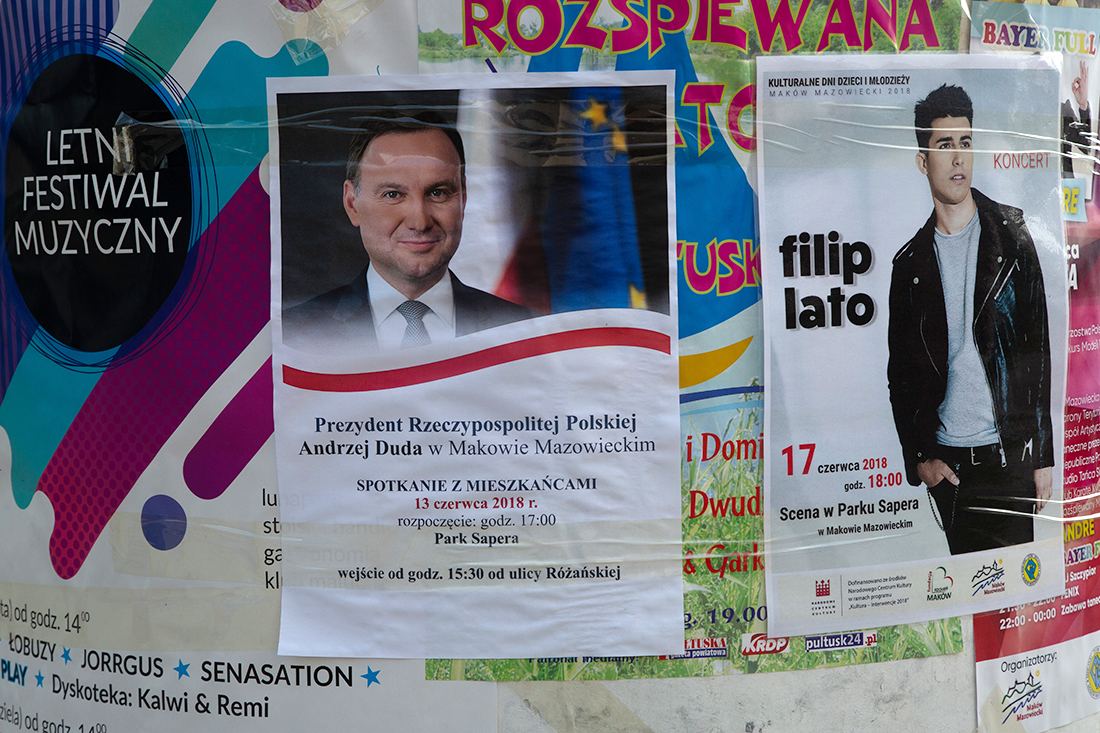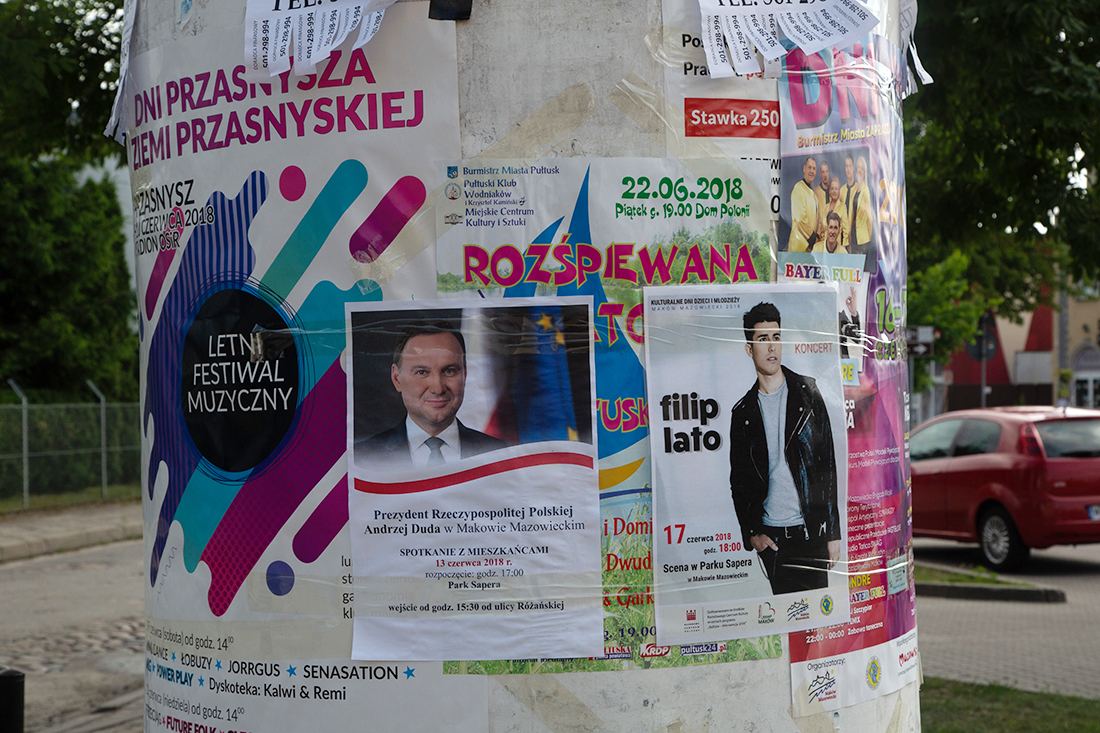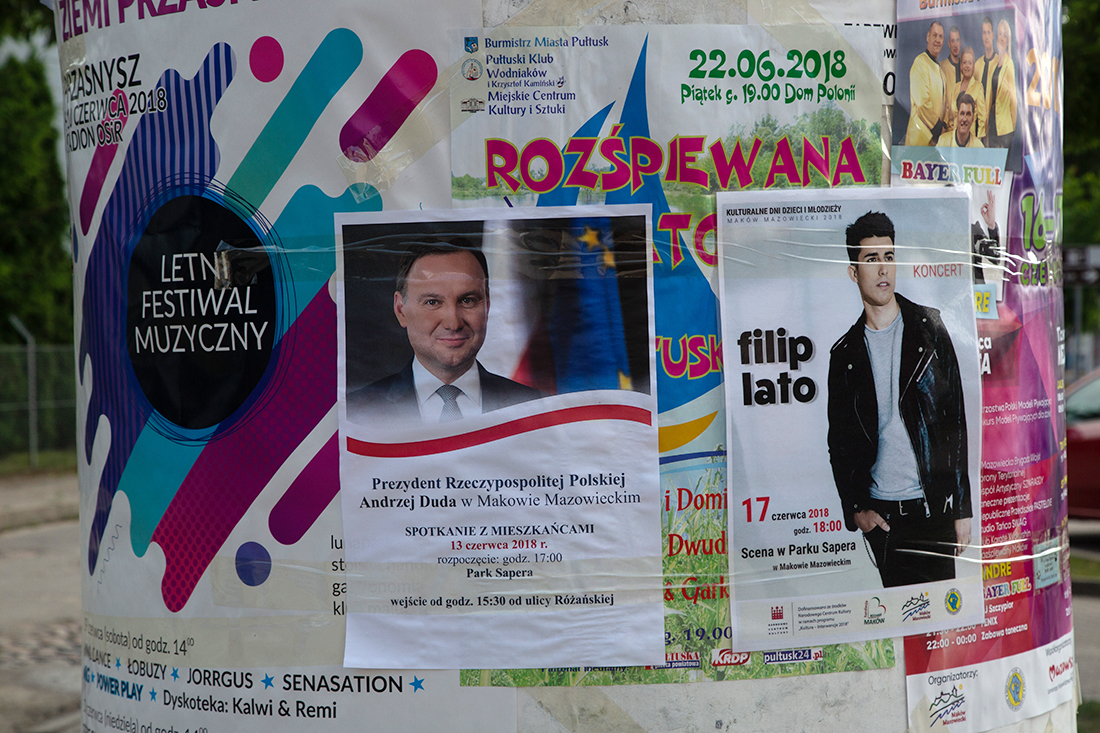 Maków jest skromnie oplakatowany informacjami o spotkaniu. Plakaty wiszą przy kościele farnym, na słupie ogłoszeniowym przy Urzędzie Miejskim (gdzie za pół godziny prezydent spotka się z samorządowcami), przy skrzyżowaniu przy poczcie oraz przed siedzibą Prawa i Sprawiedliwości na Przasnyskiej.