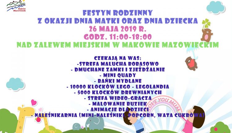 Burmistrz Miasta Maków Mazowiecki zaprasza najmłodszych Mieszkańców Miasta wraz z całymi Rodzinami na Festyn Rodzinny z okazji Dnia Matki i Dnia Dziecka.