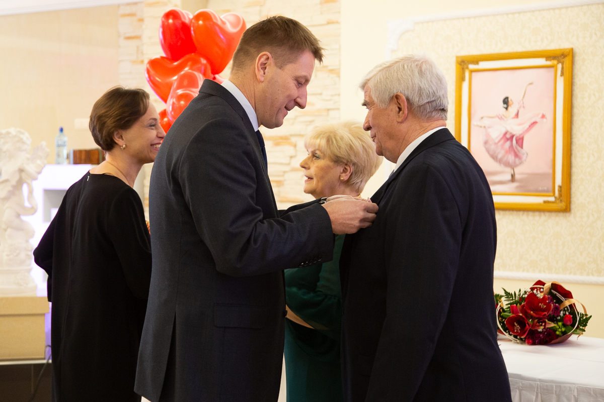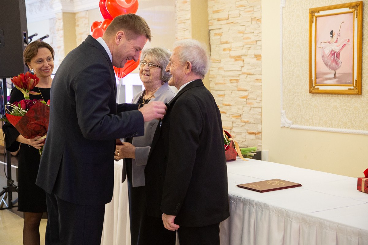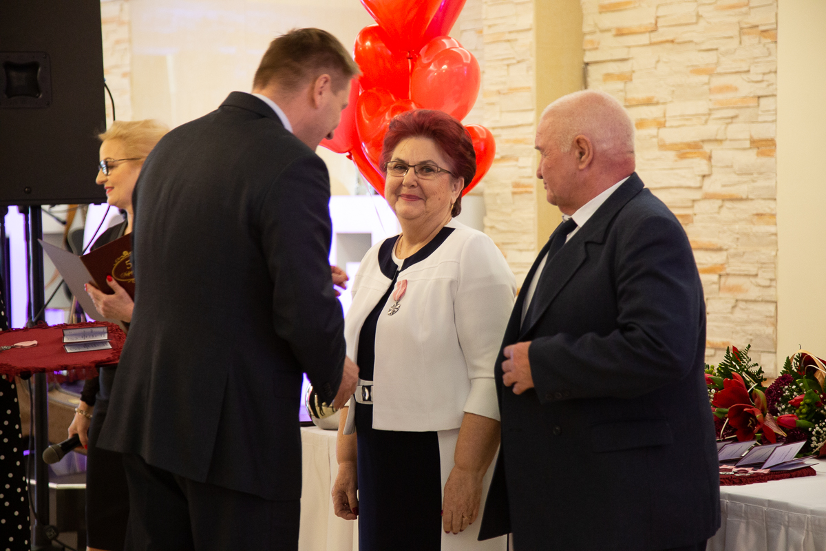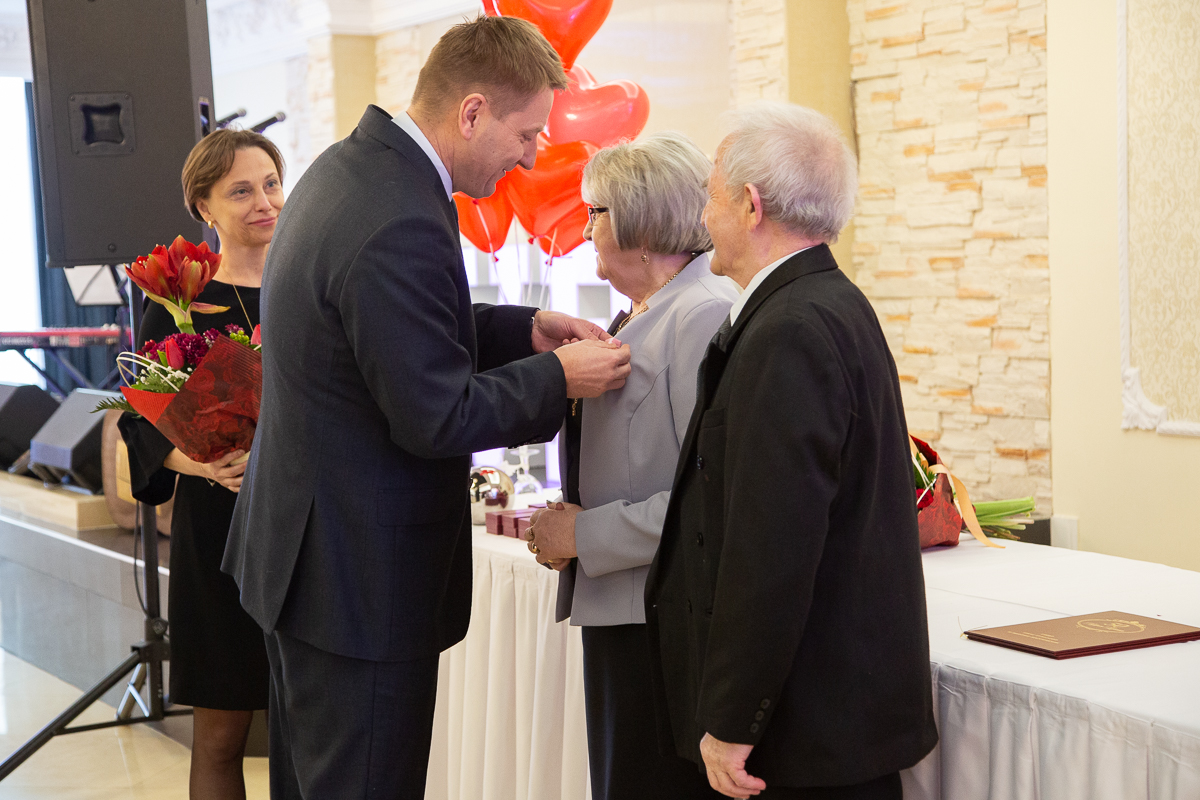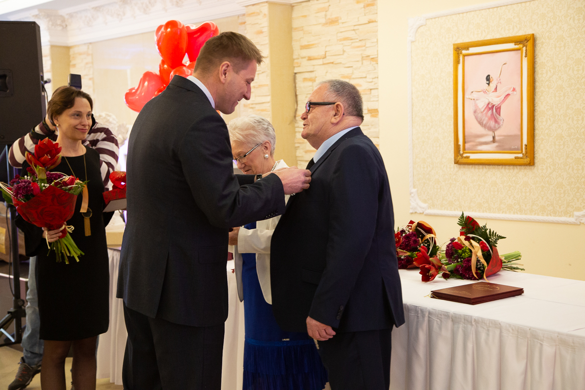 „… i nie opuszczę Cię aż do śmierci – tak brzmią słowa przysięgi małżeńskiej. Niełatwo jest wyrazić słowami wielki podziw i szacunek dla wspólnej pięćdziesięcioletniej drogi dwojga ludzi, którzy mimo trudności, różnicy charakterów idą razem przez życie. Niekiedy czule objęci, niekiedy milczący podczas cichych dni, zawsze jednak razem, dając świadectwo, że miłość przezwycięża wszystkie przeszkody i trudności. Z całego serca gratuluję Państwu wzajemnego szacunku, odpowiedzialności, cierpliwości, umiejętności wybaczania. Jesteście Państwo dla mojego pokolenia wspaniałym przykładem na to, iż miłość nie jest pustym słowem, że naprawdę warto razem iść przez życie, wspólnie cieszyć się sukcesami i razem pokonywać trudności. W tak uroczystym dla nas i zebranych tak licznie rodzin dniu, proszę przyjąć ode mnie słowa najwyższego uznania oraz życzenia zdrowia, osobistego szczęścia, pogody ducha i wielu dalszych wspólnie przeżytych dni. Wszystkiego dobrego”.