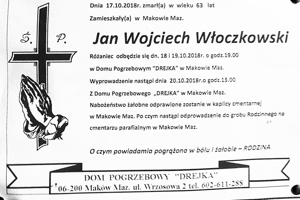 Pogrzeb Jana Włoczkowskiego odbędzie się w sobotę 20 października. Wyprowadzenie z Domu Pogrzebowego „Drejka” o godz. 15:00.  Nabożeństwo żałobne zostanie odprawione w kaplicy cmentarnej, po czym nastąpi odprowadzenie do groby rodzinnego na cmentarzu parafialnym w Makowie Maz.