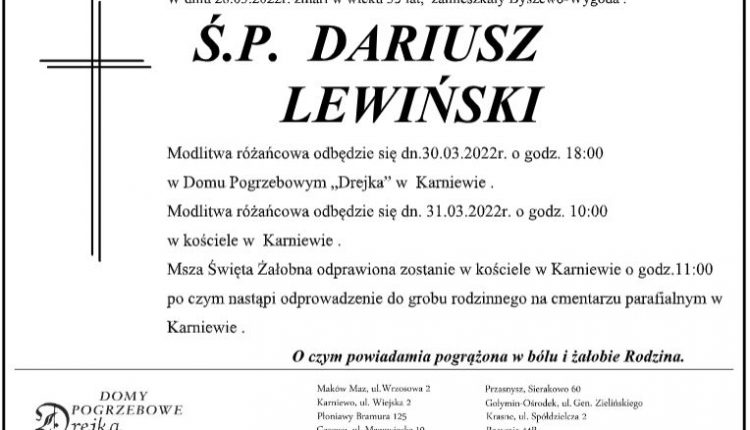Modlitwa różańcowa odbędzie się dn.30.03.2022r. o godz. 18:00 w Domu Pogrzebowym „Drejka” w Karniewie . Modlitwa różańcowa odbędzie się dn. 31.03.2022r. o godz. 10:00 w kościele w Karniewie. Msza Święta Żałobna odprawiona zostanie w kościele w Karniewie o godz.11:00 po czym nastąpi odprowadzenie do grobu rodzinnego na cmentarzu parafialnym w Karniewie .