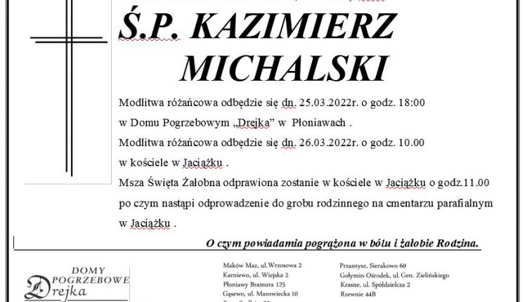 w Domu Pogrzebowym „Drejka” w Płoniawach. Modlitwa różańcowa odbędzie się dn. 6.03.2022r. o godz. 10.00 w kościele w Jaciążku . Msza Święta Żałobna odprawiona zostanie w kościele w Jaciążku o godz.11.00 po czym nastąpi odprowadzenie do grobu rodzinnego na cmentarzu parafialnym w Jaciążku .