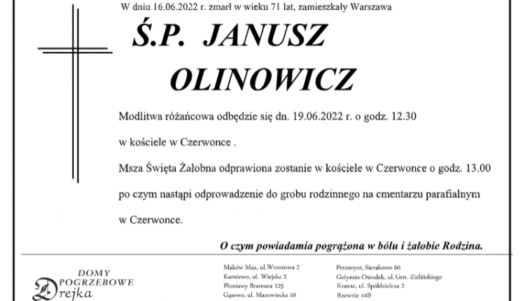 W dniu 16.06.2022 r. zmarł w wieku 71 lat, zamieszkały Warszawa