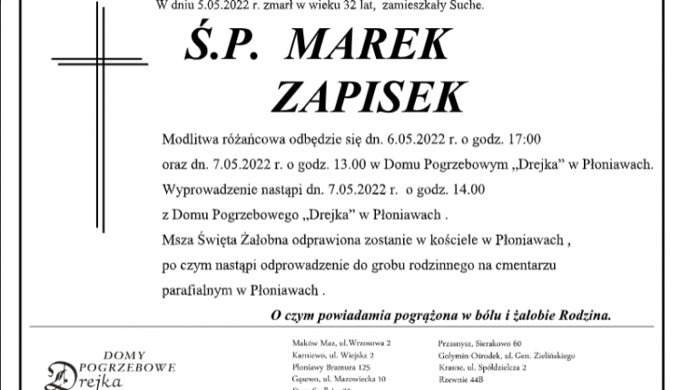 oraz dn. 7.05.2022 r. o godz. 13.00 w Domu Pogrzebowym „Drejka” w Płoniawach.