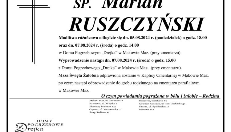 Wyprowadzenie nastąpi dn. 07.08.2024 r. (środa) o godz. 15.00 z Domu Pogrzebowego „Drejka” w Makowie Maz. (przy cmentarzu). Msza Święta Żałobna odprawiona zostanie w Kaplicy Cmentarnej w Makowie Maz. po czym nastąpi odprowadzenie do grobu rodzinnego na cmentarzu parafialnym w Makowie Maz.
