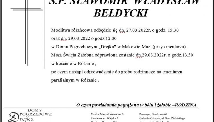 Msza Święta Żałobna odprawiona zostanie dn.29.03.2022r. o godz.13.30 w kościele w Różanie ,po czym nastąpi odprowadzenie do grobu rodzinnego na cmentarzu parafialnym w Różanie .