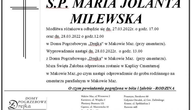 Wyprowadzenie nastąpi dn. 28.03.2022r. o godz. 13.00 z Domu Pogrzebowego „Drejka” w Makowie Maz. (przy cmentarzu).