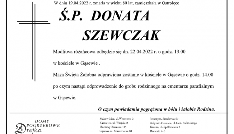 W dniu 19.04.2022 r. zmarła w wieku 80 lat, zamieszkała w Ostrołęce