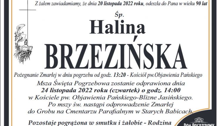 Z żalem zawiadamiamy, że dnia 20 listopada 2022 roku, odeszła do Pana w wieku 90 lat