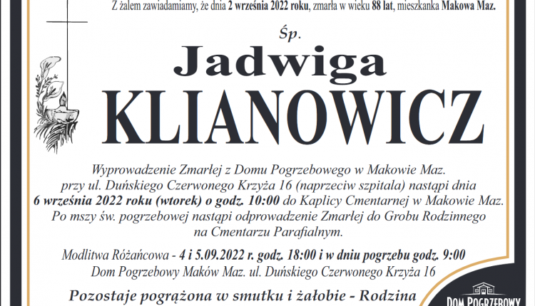 Z żalem zawiadamiamy, że dnia 2 września 2022 roku, zmarła w wieku 88 lat, mieszkanka Makowa Maz.