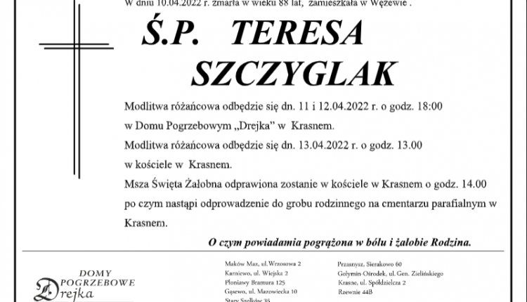 Zmarła ŚP. Teresa Szczyglak